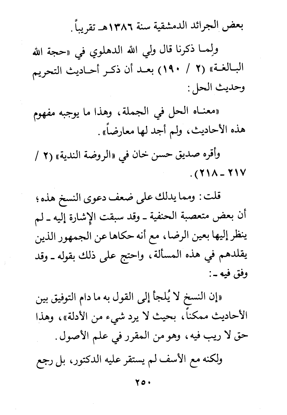 قلت: ومما يدلك على ضعف دعوى النسخ هذه أن بعض متعصبة الحنفية - وقد سبقت الإشارة إليه - لم ينظر إليها بعين الرضا مع أنه حكاها عن الجمهور الذين يقلدهم في هذه المسألة واحتج على ذلك بقوله - وقد وفق فيه -: