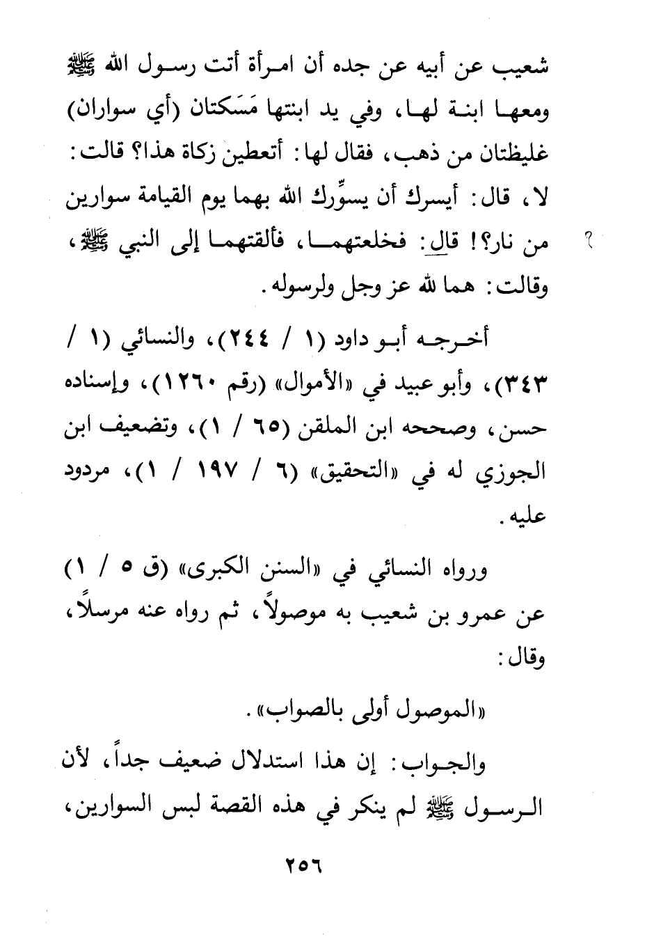 شعيب عن أبيه عن جده أن امرأة أتت رسول الله صلى الله عليه وسلم ومعها ابنة لها وفي يد ابنتها مسكتان أي سواران غليظتان من ذهب فقال لها: "أتعطين زكاة هذا؟ " قالت: لا قال: "أيسرك أن يسورك الله بهما يوم القيامة سوارين من نار؟! " قال: فخلعتهما فألقتهما إلى النبي صلى الله عليه وسلم وقالت: هما لله عز ولرسوله.