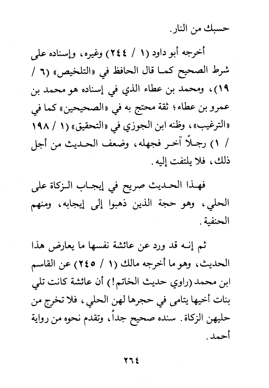 فهذا الحديث صريح في إيجاب الزكاة على الحلي وهو حجة الذين ذهبوا إلى إيجابه ومنهم الحنفية.