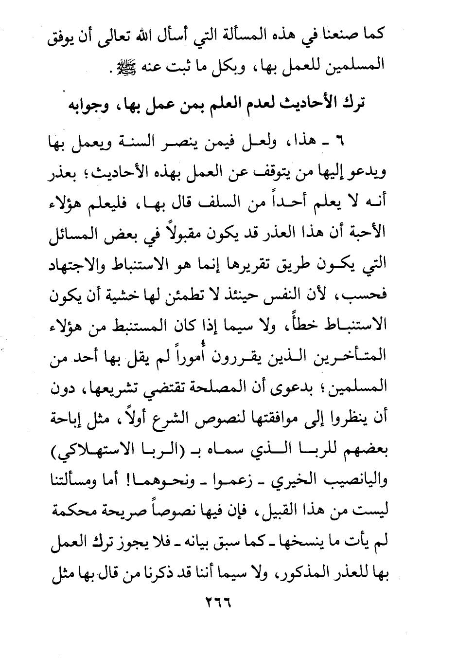 6- هذا ولعل فيمن ينصر السنة ويعمل بها ويدعو إليها من يتوقف عن العمل بهذه الأحاديث بعذر أنه لا يعلم أحدا من السلف قال بها فليعلم هؤلاء الأحبة أن هذا العذر قد يكون مقبولا في بعض المسائل التي يكون طريق تقريرها إنما هو الاستنباط والاجتهاد فحسب لأن النفس حينئذ لا تطمئن لها خشية أن يكون الاستنباط خطأ ولا سيما إذا كان المستنبط من هؤلاء المتأخرين الذين يقررون أمورا لم يقل بها أحد من المسلمين بدعوى أن المصلحة تقتضي تشريعها دون أن ينظروا إلى موافقتها لنصوص الشرع أولا مثل إباحة بعضهم للربا الذي سماه ب الربا الاستهلاكي واليانصيب الخيري - زعموا – ونحوهما! أما ومسألتنا ليست من هذا القبيل فإن فيها نصوصا صريحة محكمة لم يأت ما ينسخها - كما سبق بيانه - فلا يجوز ترك العمل بها للعذر المذكور ولا سيما أننا قد ذكرنا من قال بها مثل