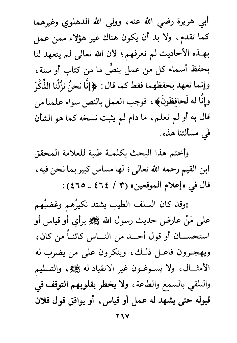 "وقد كان السلف الطيب يشتد نكيرهم وغضبهم على من عارض حديث رسول الله صلى الله عليه وسلم برأي أو قياس أو استحسان أو قول أحد من الناس كائنا من كان ويهجرون فاعل ذلك وينكرون على من يضرب له الأمثال ولا يسوغون غير الانقياد له صلى الله عليه وسلم والتسليم والتلقي بالسمع والطاعة ولا يخطر بقلوبهم التوقف في قبوله حتى يشهد له عمل أو قياس أو يوافق قول فلان وفلان