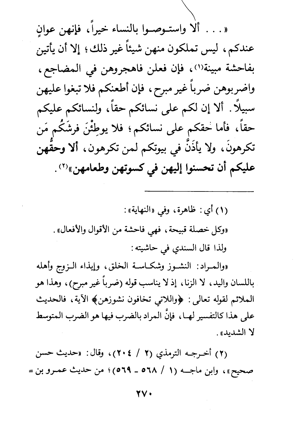 " ... ألا واستوصوا بالنساء خيرا فإنهن عوان عندكم ليس تملكون منهن شيئا غير ذلك إلا أن يأتين بفاحشة مبينة1 فإن فعلن فاهجروهن في المضاجع واضربوهن ضربا غير مبرح فإن أطعنكم فلا تبغوا عليهن سبيلا. إلا إن لكم على نسائكم حقا ولنسائكم عليكم حقا فأما حقكم على نسائكم فلا يوطئن فرشكم من تكروهن ولا يأذن في بيوتكم لمن تكرهون ألا وحقهن عليكم أن تحسنوا إليهن في كسوتهن وطعامهن" 2.
