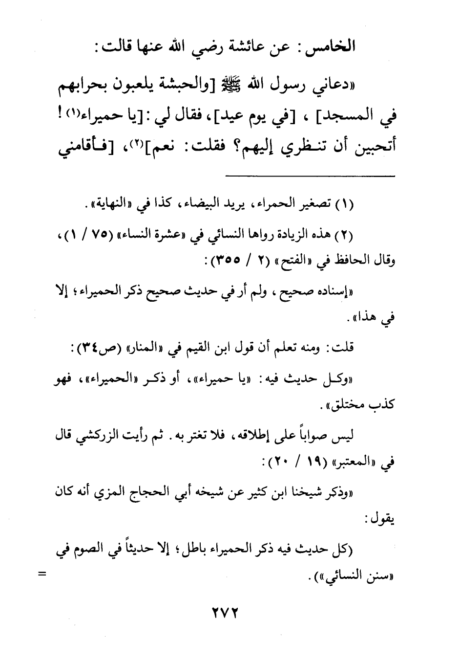 "وكل حديث فيه "ياحميراء" أو ذكر الحميراء فهو كذب مختلق".