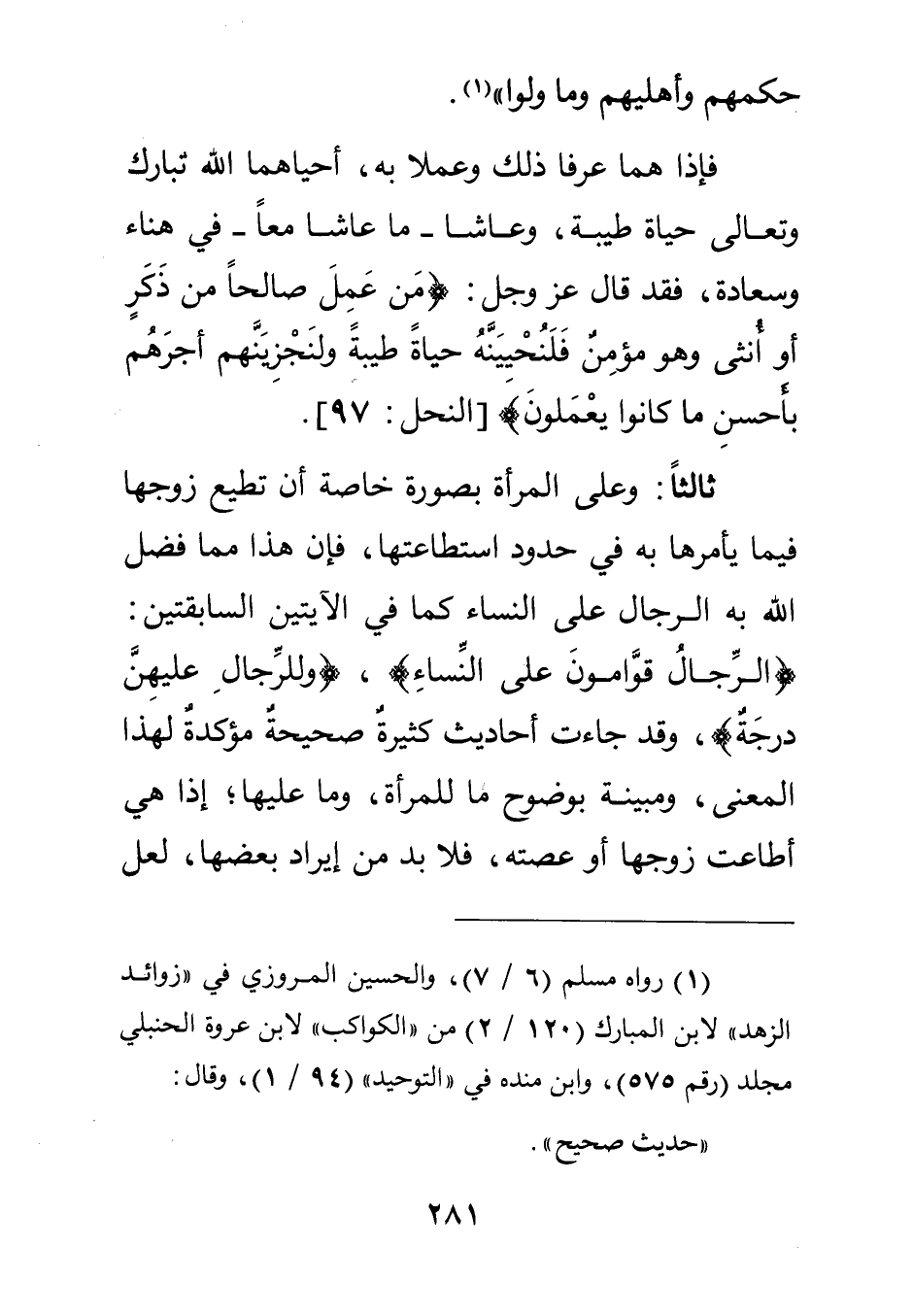 ثالثا: وعلى المرأة بصورة خاصة أن تطيع زوجها فيما يأمرها به في حدود استطاعتها فإن هذا مما فضل الله به الرجال على النساء كما في الآيتين السابقتين: {الرِّجَالُ قَوَّامُونَ عَلَى النِّسَاءِ} {وَلِلرِّجَالِ عَلَيْهِنَّ دَرَجَةٌ} وقد جاءت أحاديث كثيرة صحيحة مؤكدة لهذا المعنى ومبينة بوضوح ما للمرأة وما عليها إذا هي أطاعت زوجها أو عصته فلا بد من إيراد بعضها لعل