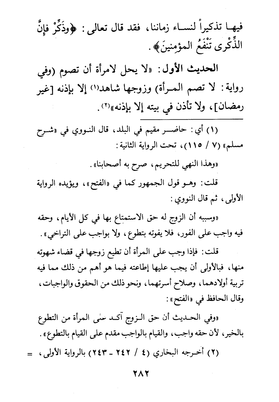 الحديث الأول: "لا يحل لأمرأة أن تصوم وفي رواية: لا تصم المرأة وزوجها شاهد1 إلا بإذنه [غير رمضان] ولا تأذن في بيته إلا بإذنه" 2.