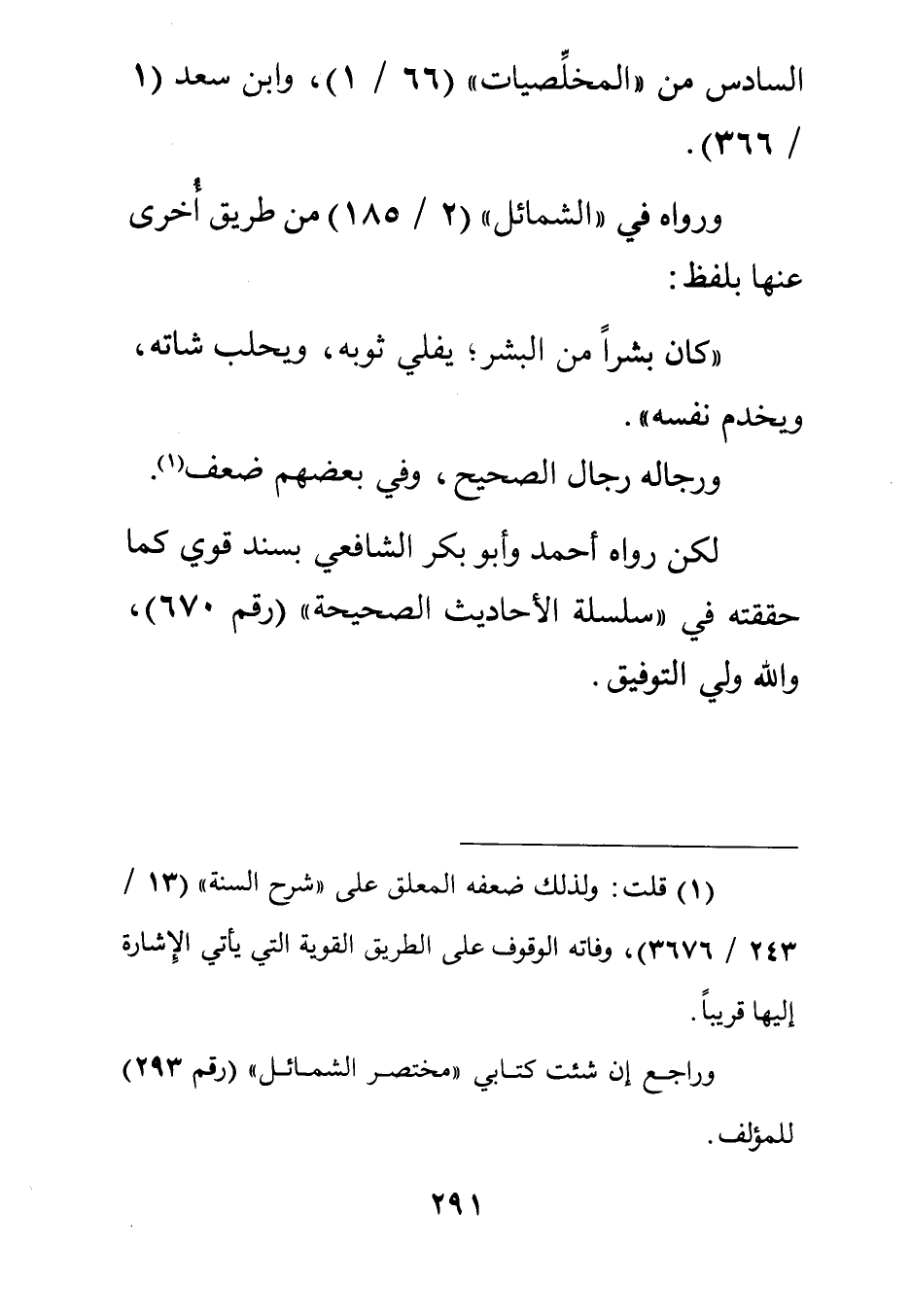1 قلت: ولذلك ضعفه المعلق على شرح السنة 13 / 243 / 3676 وفاته الوقوف على الطريق القوية التي يأتي الإشارة إليها قريبا. وراجع إن شئت كتابي "مختصر الشمائل" رقم 293 للمؤلف.