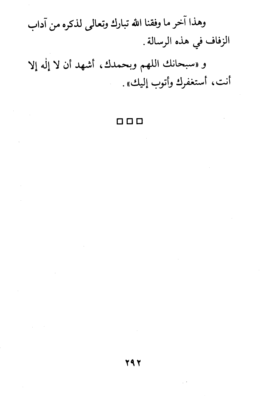 وهذا آخر ما وفقنا الله تبارك وتعالى لذكره من آداب الزفاف في هذه الرسالة.