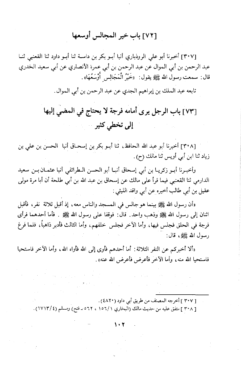 251 - أَخْبَرَنَا أَبُو عَبْدِ اللَّهِ الْحَافِظُ، حَدَّثَنَا أَبُو بَكْرِ بْنُ إِسْحَاقَ، أَنْبَأَنَا الْحَسَنُ بْنُ عَلِيِّ بْنِ زِيَادٍ، حَدَّثَنَا ابْنُ أَبِي أُوَيْسٍ، حَدَّثَنَا مَالِكٌ ح. وَأَخْبَرَنَا أَبُو زَكَرِيَّا بْنُ أَبِي إِسْحَاقَ، أَنْبَأَنَا أَبُو الْحَسَنِ الطَّرَائِفِيُّ، أَنْبَأَنَا عُثْمَانُ بْنُ سَعِيدٍ الدَّارِمِيُّ، حَدَّثَنَا الْقَعْنَبِيُّ فِيمَا قَرَأَ عَلَى مَالِكٍ، عَنْ إِسْحَاقَ بْنِ عَبْدِ اللَّهِ بْنِ أَبِي طَلْحَةَ أَنَّ أَبَا مُرَّةَ مَوْلَى عَقِيلِ بْنِ أَبِي طَالِبٍ أَخْبَرَهُ، عَنْ أَبِي وَاقِدٍ اللَّيْثِيِّ أَنَّ رَسُولَ اللَّهِ صَلَّى اللَّهُ عَلَيْهِ وَسَلَّمَ بَيْنَمَا هُوَ جَالِسٌ فِي الْمَسْجِدِ وَالنَّاسُ مَعَهُ إِذْ أَقْبَلَ ثَلَاثَةُ نَفَرٍ فَأَقْبَلَ اثْنَانِ إِلَى رَسُولِ اللَّهِ صَلَّى اللَّهُ عَلَيْهِ وَسَلَّمَ وَذَهَبَ وَاحِدٌ. قَالَ: فَوَقَفَا عَلَى رَسُولِ اللَّهِ صَلَّى اللَّهُ عَلَيْهِ وَسَلَّمَ، فَأَمَّا أَحَدُهُمَا فَرَأَى فُرْجَةً فِي الْحَلْقَةِ فَجَلَسَ فِيهَا، وَأَمَّا الْآخَرُ فَجَلَسَ خَلْفَهُمْ، وَأَمَّا الثَّالِثُ فَأَدْبَرَ ذَاهِبًا، فَلَمَّا فَرَغَ رَسُولُ اللَّهِ صَلَّى اللَّهُ عَلَيْهِ وَسَلَّمَ قَالَ: §«أَلَا أُخْبِرُكُمْ عَنِ النَّفَرِ الثَّلَاثَةِ؟ أَمَّا أَحَدُهُمْ فَأَوَى إِلَى اللَّهِ فَأَوَاهُ اللَّهُ، وَأَمَّا الْآخَرُ فَاسْتَحْيَا فَاسْتَحْيَا اللَّهُ مِنْهُ، وَأَمَّا الْآخَرُ فَأَعْرَضَ فَأَعْرَضَ اللَّهُ عَنْهُ»