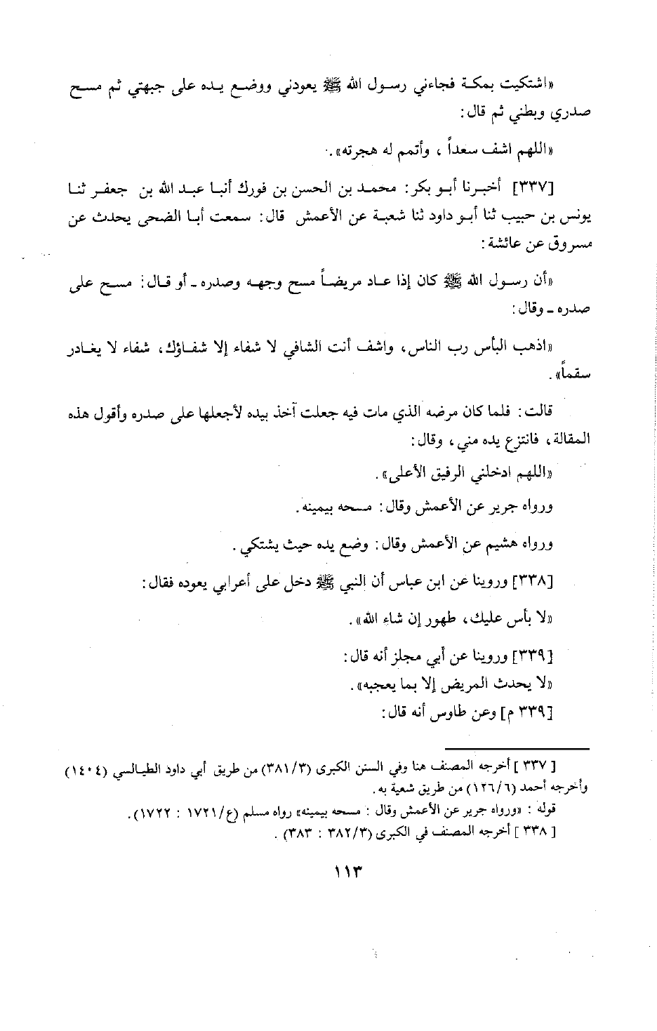 274 - أَخْبَرَنَا أَبُو بَكْرٍ مُحَمَّدُ بْنُ الْحَسَنِ بْنِ فُورَكٍ، أَنْبَأَنَا عَبْدُ اللَّهِ بْنُ جَعْفَرٍ، حَدَّثَنَا يُونُسُ بْنُ حَبِيبٍ، حَدَّثَنَا أَبُو دَاوُدَ، حَدَّثَنَا شُعْبَةُ، عَنِ الْأَعْمَشِ قَالَ: سَمِعْتُ أَبَا الضُّحَى يُحَدِّثُ عَنْ مَسْرُوقٍ، عَنْ عَائِشَةَ أَنَّ رَسُولَ اللَّهِ صَلَّى اللَّهُ عَلَيْهِ وَسَلَّمَ كَانَ إِذَا عَادَ مَرِيضًا مَسَحَ وَجْهَهُ وَصَدْرَهُ - أَوْ قَالَ: مَسَحَ عَلَى صَدْرِهِ وَقَالَ: «§أَذْهِبِ الْبَأْسَ رَبَّ النَّاسِ، وَاشْفِ أَنْتَ الشَّافِي لَا شِفَاءَ إِلَّا شِفَاؤُكَ، شِفَاءً لَا يُغَادِرُ سَقَمًا» . قَالَتْ: فَلَمَّا كَانَ فِي مَرَضِهِ الَّذِي مَاتَ فِيهِ جَعَلْتُ آخُذُ بِيَدِهِ لِأَجْعَلَهَا عَلَى صَدْرِهِ وَأَقُولُ هَذِهِ الْمَقَالَةَ، فَانْتَزَعَ يَدَهُ مِنِّي، وَقَالَ: «اللَّهُمَّ أَدْخِلْنِي الرَّفِيقَ الْأَعْلَى» . وَرَوَاهُ جَرِيرٌ عَنِ الْأَعْمَشِ وَقَالَ: مَسَحَهُ بِيَمِينِهِ. وَرَوَاهُ هُشَيْمٌ عَنِ الْأَعْمَشِ وَقَالَ: وَضَعَ يَدَهُ حَيْثُ يَشْتَكِي. وَرُوِّينَا عَنِ ابْنِ عَبَّاسٍ أَنَّ النَّبِيَّ صَلَّى اللَّهُ عَلَيْهِ وَسَلَّمَ دَخَلَ عَلَى أَعْرَابِيٍّ يَعُودُهُ فَقَالَ: «لَا بَأْسَ عَلَيْكَ، طَهُورٌ إِنْ شَاءَ اللَّهُ» . وَرُوِّينَا عَنْ أَبِي مِجْلَزٍ أَنَّهُ قَالَ: لَا يُحَدَّثُ الْمَرِيضُ إِلَّا بِمَا يُعْجِبُهُ. وَعَنْ طَاوُسٍ أَنَّهُ قَالَ: -[114]- أَفْضَلُ الْعِيَادَةِ أَخَفُّهَا. وَرُوِيَ ذَلِكَ مَرْفُوعًا. وَرُوِّينَا فِي كِتَابِ الْجَنَائِزِ حَدِيثَ أَبِي سَعِيدٍ، عَنِ النَّبِيِّ صَلَّى اللَّهُ عَلَيْهِ وَسَلَّمَ: «لَقِّنُوا مَوْتَاكُمْ لَا إِلَهَ إِلَّا اللَّهُ» فَيُسْتَحَبُّ ذَلِكَ لِمَنْ شَهِدَ مَرِيضًا حَضَرَهُ الْمَوْتُ