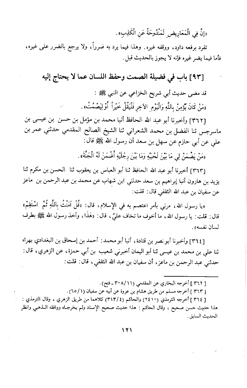 §بَابُ فَضِيلَةِ الصَّمْتِ وَحِفْظِ اللِّسَانِ عَمَّا لَا يُحْتَاجُ إِلَيْهِ قَدْ مَضَى حَدِيثُ أَبِي شُرَيْحٍ الْخُزَاعِيِّ، عَنِ النَّبِيِّ صَلَّى اللَّهُ عَلَيْهِ وَسَلَّمَ: «مَنْ كَانَ يُؤْمِنُ بِاللَّهِ وَالْيَوْمِ الْآخِرِ فَلْيَقُلْ خَيْرًا أَوْ لِيَصْمُتْ»