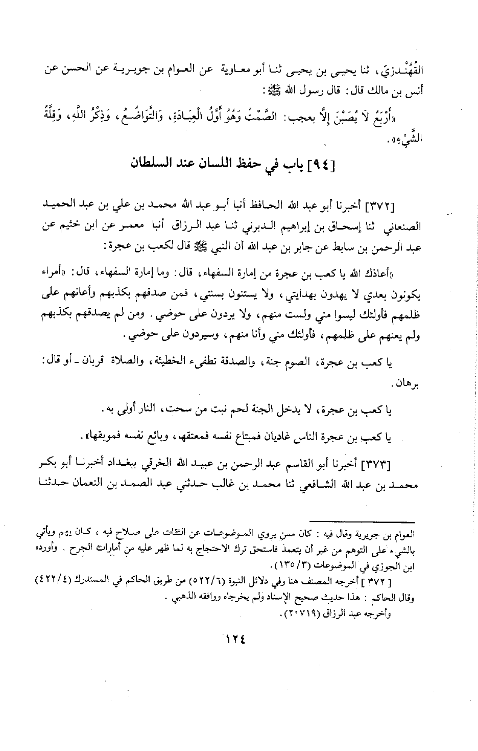 300 - أَخْبَرَنَا أَبُو عَبْدِ اللَّهِ الْحَافِظُ، أَنْبَأَنَا أَبُو عَبْدِ اللَّهِ مُحَمَّدُ بْنُ عَلِيِّ بْنِ عَبْدِ الْحَمِيدِ الصَّنْعَانِيُّ، أَنْبَأَنَا إِسْحَاقُ بْنُ إِبْرَاهِيمَ الدَّيْرَنِيُّ، حَدَّثَنَا عَبْدُ الرَّزَّاقِ، أَنْبَأَنَا مَعْمَرٌ، عَنِ ابْنِ خَيْثَمٍ، عَنْ عَبْدِ الرَّحْمَنِ بْنِ سَابِطٍ، عَنْ جَابِرِ بْنِ عَبْدِ اللَّهِ أَنَّ النَّبِيَّ صَلَّى اللَّهُ عَلَيْهِ وَسَلَّمَ قَالَ لِكَعْبِ بْنِ عُجْرَةَ: §«أَعَاذَكَ اللَّهُ يَا كَعْبُ بْنَ عُجْرَةَ مِنْ إِمَارَةِ السُّفَهَاءِ» قَالَ: وَمَا إِمَارَةُ السُّفَهَاءِ؟ قَالَ: «أُمَرَاءُ يَكُونُونَ بَعْدِي لَا يَهْدُونَ بِهِدَايَتِي، وَلَا يَسْتَنُّونَ بِسُنَّتِي، فَمَنْ صَدَّقَهُمْ بِكَذِبِهِمْ وَأَعَانَهُمْ عَلَى ظُلْمِهِمْ فَأُولَئِكَ لَيْسُوا مِنِّي وَلَسْتُ مِنْهُمْ، وَلَا يَرِدُونَ عَلَى حَوْضِي، وَمَنْ لَمْ يُصَدِّقْهُمْ بِكَذِبِهِمْ وَلَمْ يُعِنْهُمْ عَلَى ظُلْمِهِمْ فَأُولَئِكَ مِنِّي وَأَنَا مِنْهُمْ، وَسَيَرِدُونَ عَلَى حَوْضِي. يَا كَعْبُ بْنَ عُجْرَةَ، الصَّوْمُ جُنَّةٌ، وَالصَّدَقَةُ تُطْفِئُ الْخَطِيئَةَ، وَالصَّلَاةُ قُرْبَانٌ» ، أَوْ قَالَ: «بُرْهَانٌ» . يَا كَعْبُ بْنَ عُجْرَةَ، لَا يَدْخُلُ الْجَنَّةَ لَحْمٌ نَبَتَ مِنْ سُحْتٍ، النَّارُ أَوْلَى بِهِ «.» يَا كَعْبُ بْنَ عُجْرَةَ غَادِيَانِ فَمُبْتَاعٌ نَفْسَهُ فَمُعْتِقُهَا، وَبَائِعٌ نَفْسَهُ فَمُوبِقُهَا "