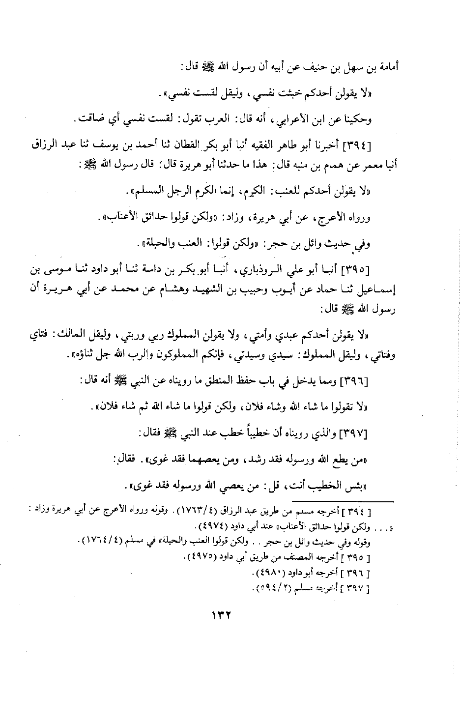 320 - أَخْبَرَنَا أَبُو طَاهِرٍ الْفَقِيهُ، أَنْبَأَنَا أَبُو بَكْرٍ الْقَطَّانُ، حَدَّثَنَا أَحْمَدُ بْنُ يُوسُفَ، حَدَّثَنَا عَبْدُ الرَّزَّاقِ، أَنْبَأَنَا مَعْمَرٌ، عَنْ هَمَّامِ بْنِ مُنَبِّهٍ قَالَ: هَذَا مَا حَدَّثَنَا أَبُو هُرَيْرَةَ قَالَ: قَالَ رَسُولُ اللَّهِ صَلَّى اللَّهُ عَلَيْهِ وَسَلَّمَ: «§لَا يَقُولَنَّ أَحَدُكُمْ لِلْعِنَبِ الْكَرْمَ، إِنَّمَا الْكَرْمُ الرَّجُلُ الْمُسْلِمُ» . وَرَوَاهُ الْأَعْرَجُ، عَنْ أَبِي هُرَيْرَةَ وَزَادَ: «وَلَكِنْ قُولُوا حَدَائِقَ الْأَعْنَابِ» . وَفِي حَدِيثِ وَائِلِ بْنِ حُجْرٍ: وَلَكِنْ قُولُوا: «الْعِنَبُ وَالْحَبْلَةُ»