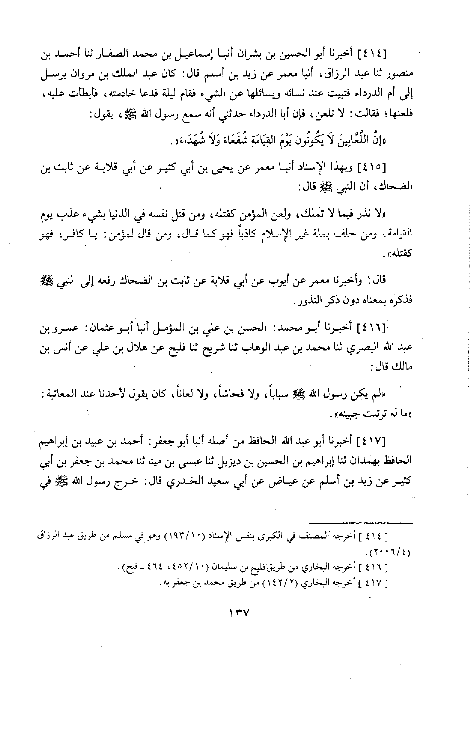 332 - أَخْبَرَنَا أَبُو الْحُسَيْنِ بْنُ بِشْرَانَ، أَنْبَأَنَا إِسْمَاعِيلُ بْنُ مُحَمَّدٍ الصَّفَّارُ، حَدَّثَنَا أَحْمَدُ بْنُ مَنْصُورٍ، حَدَّثَنَا عَبْدُ الرَّزَّاقِ، أَنْبَأَنَا مَعْمَرٌ، عَنْ زَيْدِ بْنِ أَسْلَمَ قَالَ: كَانَ عَبْدُ الْمَلِكِ بْنُ مَرْوَانَ يُرْسِلُ إِلَى أُمِّ الدَّرْدَاءِ فَتَبِيتُ عِنْدَ نِسَائِهِ وَنُسَائِلُهَا عَنِ الشَّيْءِ، فَقَامَ لَيْلَةً فَدَعَا خَادِمَتَهُ فَأَبْطَأَتْ عَلَيْهِ فَلَعَنَهَا، فَقَالَتْ: لَا تَلْعَنْ، فَإِنَّ أَبَا الدَّرْدَاءِ، حَدَّثَنِي أَنَّهُ سَمِعَ رَسُولَ اللَّهِ صَلَّى اللَّهُ عَلَيْهِ وَسَلَّمَ يَقُولُ: «إِنَّ §اللَّعَّانِينَ لَا يَكُونُونَ يَوْمَ الْقِيَامَةِ شُفَعَاءَ وَلَا شُهَدَاءَ»