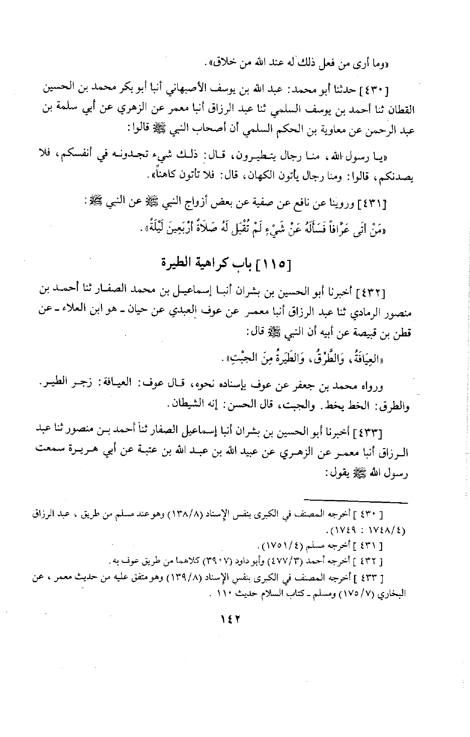 343 - حَدَّثَنَا أَبُو مُحَمَّدٍ عَبْدُ اللَّهِ بْنُ يُوسُفَ السُّلَمِيُّ، حَدَّثَنَا عَبْدُ الرَّزَّاقِ، أَنْبَأَنَا مَعْمَرٌ، عَنِ الزُّهْرِيِّ، عَنِ أَبِي سَلَمَةَ بْنِ عَبْدِ الرَّحْمَنِ، عَنْ مُعَاوِيَةَ بْنِ الْحَكَمِ السُّلَمِيِّ أَنَّ أَصْحَابَ النَّبِيِّ صَلَّى اللَّهُ عَلَيْهِ وَسَلَّمَ قَالُوا: يَا رَسُولَ اللَّهِ مِنَّا رِجَالٌ يَتَطَيَّرُونَ قَالَ: «ذَلِكَ شَيْءٌ تَجِدُونَهُ فِي أَنْفُسِكُمْ، فَلَا يَصُدَّنَّكُمْ» قَالُوا: وَمِنَّا رِجَالٌ يَأْتُونَ الْكُهَّانَ قَالَ: «§فَلَا تَأْتُوا كَاهِنًا» . وَرُوِّينَا عَنْ نَافِعٍ، عَنْ صَفِيَّةَ عَنْ بَعْضِ أَزْوَاجِ النَّبِيِّ صَلَّى اللَّهُ عَلَيْهِ وَسَلَّمَ، عَنِ النَّبِيِّ صَلَّى اللَّهُ عَلَيْهِ وَسَلَّمَ: «مَنْ أَتَى عَرَّافًا فَسَأَلَهُ عَنْ شَيْءٍ لَمْ تُقْبَلْ لَهُ صَلَاةُ أَرْبَعِينَ لَيْلَةً»