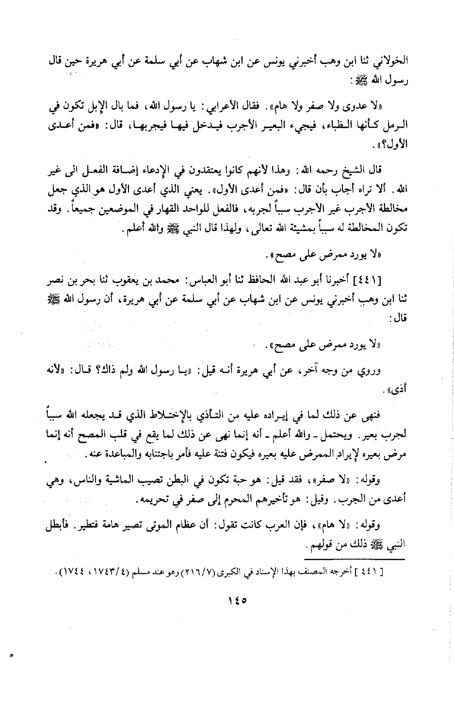 350 - أَخْبَرَنَا أَبُو عَبْدِ اللَّهِ الْحَافِظُ، حَدَّثَنَا أَبُو الْعَبَّاسِ مُحَمَّدُ بْنُ يَعْقُوبَ، حَدَّثَنَا بَحْرُ بْنُ نَصْرٍ، حَدَّثَنَا ابْنُ وَهْبٍ، أَخْبَرَنِي يُونُسُ، عَنِ ابْنِ شِهَابٍ، عَنْ أَبِي سَلَمَةَ، عَنْ أَبِي هُرَيْرَةَ أَنَّ رَسُولَ اللَّهِ صَلَّى اللَّهُ عَلَيْهِ وَسَلَّمَ قَالَ: §«لَا يُورِدُ مُمْرِضٌ عَلَى مُصِحٍّ» . وَرُوِيَ مِنْ وَجْهٍ آخَرَ عَنْ أَبِي هُرَيْرَةَ أَنَّهُ قِيلَ: يَا رَسُولَ اللَّهِ وَلِمَ ذَاكَ؟ قَالَ: «لِأَنَّهُ أَذًى» . فَنَهَى عَنْ ذَلِكَ لِمَا فِي إِيرَادِهِ عَلَيْهِ مِنَ التَّأَذِّي بِالِاخْتِلَاطِ الَّذِي قَدْ يَجْعَلُهُ اللَّهُ سَبَبًا لِجَرَبِ بَعِيرٍ، وَيُحْتَمَلُ وَاللَّهُ أَعْلَمُ أَنَّهُ إِنَّمَا نَهَى عَنْ ذَلِكَ لِمَا يَقَعُ فِي قَلْبِ الْمُصِحِّ أَنَّهُ مَرِضَ بَعِيرُهُ لِإِيرَادِ الْمُمْرِضِ عَلَيْهِ بَعِيرَهُ فَيَكُونُ فِتْنَةً عَلَيْهِ فَأَمَرَ بِاجْتِنَابِهِ وَالْمُبَاعَدَةِ عَنْهُ، وَقَوْلُهُ: لَا صَفَرَ، فَقَدْ قِيلَ: هُوَ حَبَّةٌ تَكُونُ فِي الْبَطْنِ تُصِيبُ الْمَاشِيَةَ وَالنَّاسَ، وَهِيَ أَعْدَى مِنَ الْجَرَبِ وَقِيلَ: هُوَ تَأْخِيرُهُمُ الْمُحَرَّمَ إِلَى صَفَرَ فِي تَحْرِيمِهِ، وَقَوْلُهُ: لَا هَامَّ، فَإِنَّ الْعَرَبَ كَانَتْ تَقُولُ: إِنَّ عِظَامَ الْمَوْتَى تَصِيرُ هَامَةً فَتَطِيرُ فَأَبْطَلَ النَّبِيُّ صَلَّى اللَّهُ عَلَيْهِ وَسَلَّمَ ذَلِكَ مِنْ قَوْلِهِمْ. -[146]- وَأَمَّا الْحَدِيثُ الَّذِي رُوِيَ فِي حَدِيثِ عَمْرِو بْنِ الشَّرِيدِ، عَنْ أَبِيهِ أَنَّهُ قَالَ: كَانَ فِي وَفْدِ ثَقِيفٍ رَجُلٌ مَجْذُومٌ فَأَرْسَلَ إِلَيْهِ النَّبِيُّ صَلَّى اللَّهُ عَلَيْهِ وَسَلَّمَ «أَنَّا قَدُ بَايَعْنَاكَ فَارْجِعْ» . وَفِي حَدِيثِ أَبِي هُرَيْرَةَ مَرْفُوعًا: «فِرَّ مِنَ الْمَجْذُومِ فِرَارَكَ مِنَ الْأَسَدِ» . فَإِنَّمَا هُوَ لِمَا فِي مُخَالَطَتِهِ مِنَ الْأَذَى الَّذِي ذَكَرْنَاهُ فِي إِيرَادِ الْمُمْرِضِ عَلَى الْمُصِحِّ، أَوِ الْفِتْنَةِ الَّتِي أَشَرْنَا إِلَيْهَا فِيهِ