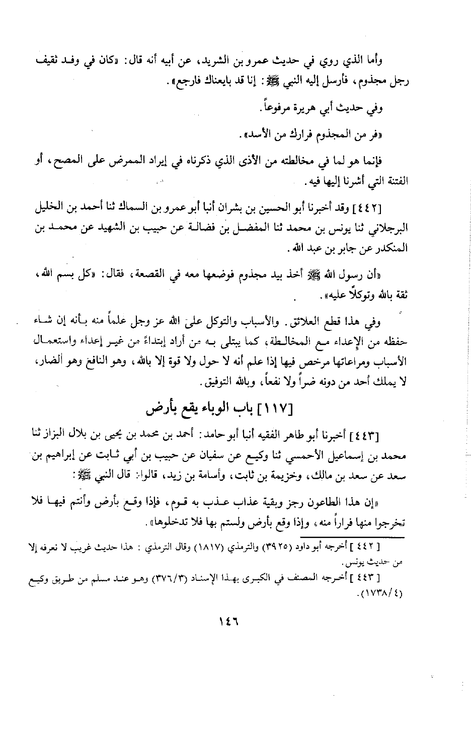 351 - وَقَدْ أَخْبَرَنَا أَبُو الْحُسَيْنِ بْنُ بِشْرَانَ، أَنْبَأَنَا أَبُو عَمْرِو بْنُ السَّمَّاكِ، حَدَّثَنَا أَحْمَدُ بْنُ الْخَلِيلِ الْبُرْجُلَانِيُّ، حَدَّثَنَا يُونُسُ بْنُ مُحَمَّدٍ، حَدَّثَنَا الْمُفَضَّلُ بْنُ فَضَالَةَ، عَنْ حَبِيبِ بْنِ الشَّهِيدِ، عَنْ مُحَمَّدِ بْنِ الْمُنْكَدِرِ، عَنْ جَابِرِ بْنِ عَبْدِ اللَّهِ أَنَّ رَسُولَ اللَّهِ صَلَّى اللَّهُ عَلَيْهِ وَسَلَّمَ §أَخَذَ بِيَدِ مَجْذُومٍ فَوَضَعَهَا مَعَهُ فِي الْقَصْعَةِ فَقَالَ: «كُلْ بِسْمِ اللَّهِ، ثِقَةً بِاللَّهِ وَتَوَكُّلًا عَلَيْهِ» . وَفِي هَذَا قَطْعُ الْعَلَائِقِ وَالْأَسْبَابِ وَالتَّوَكُّلُ عَلَى اللَّهِ عَزَّ وَجَلَّ عِلْمًا مِنْهُ بِأَنَّهُ إِنْ شَاءَ حَفِظَهُ مِنَ الْإِعْدَاءِ مَعَ الْمُخَالَطَةِ، كَمَا يَبْتَلِي بِهِ مَنْ أَرَادَ ابْتِدَاءً مِنْ غَيْرِ إِعْدَاءٍ، وَاسْتِعْمَالُ الْأَسْبَابِ وَمُرَاعَاتُهَا مُرَخَّصٌ فِيهَا إِذَا عَلِمَ أَنَّهُ لَا حَوْلَ وَلَا قُوَّةَ إِلَّا بِاللَّهِ، وَهُوَ النَّافِعُ وَهُوَ الضَّارُّ، لَا يَمْلِكُ أَحَدٌ مِنْ دُونِهِ ضَرًّا وَلَا نَفْعًا، وَبِاللَّهِ التَّوْفِيقُ