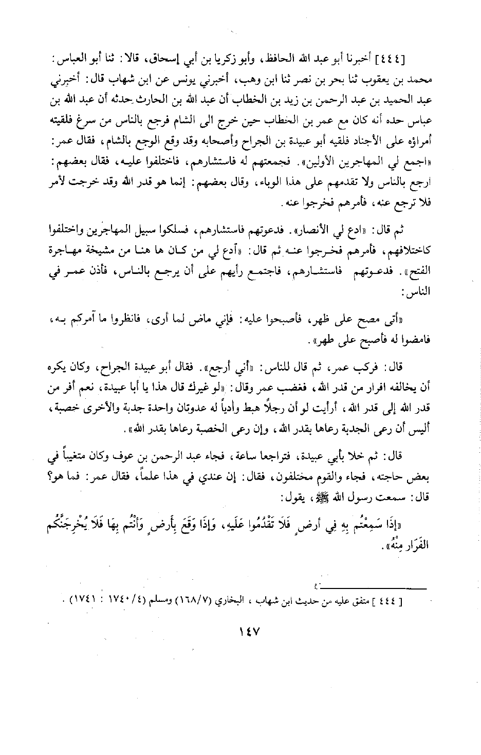 353 - أَخْبَرَنَا أَبُو عَبْدِ اللَّهِ الْحَافِظُ، وَأَبُو زَكَرِيَّا بْنُ أَبِي إِسْحَاقَ قَالَا: حَدَّثَنَا أَبُو الْعَبَّاسِ مُحَمَّدُ بْنُ يَعْقُوبَ، حَدَّثَنَا بَحْرُ بْنُ نَصْرٍ، حَدَّثَنَا ابْنُ وَهْبٍ، أَخْبَرَنِي يُونُسُ، عَنِ ابْنِ شِهَابٍ قَالَ: أَخْبَرَنِي عَبْدُ الْحَمِيدِ بْنُ عَبْدِ الرَّحْمَنِ بْنِ زَيْدِ بْنِ الْخَطَّابِ أَنَّ عَبْدَ اللَّهِ بْنَ الْحَارِثِ حَدَّثَهُ، أَنَّ عَبْدَ اللَّهِ بْنَ عَبَّاسٍ، حَدَّثَهُ، أَنَّهُ كَانَ مَعَ عُمَرَ بْنِ الْخَطَّابِ حِينَ خَرَجَ إِلَى الشَّامِ فَرَجَعَ بِالنَّاسِ مِنْ سَرْغٍ فَلَقِيَهُ أُمَرَاؤُهُ عَلَى الْأَجْنَادِ فَلَقِيَهُ أَبُو عُبَيْدَةَ بْنُ الْجَرَّاحِ وَأَصْحَابُهُ وَقَدْ وَقَعَ الْوَجَعُ بِالشَّامِ، فَقَالَ عُمَرُ: اجْمَعْ لِي الْمُهَاجِرِينَ الْأَوَّلِينَ فَجَمَعْتُهُمْ لَهُ فَاسْتَشَارَهُمْ فَاخْتَلَفُوا عَلَيْهِ، فَقَالَ بَعْضُهُمُ: ارْجِعْ بِالنَّاسِ وَلَا تُقْدِمْهُمْ عَلَى الْوَبَاءِ، وَقَالَ بَعْضُهُمْ: إِنَّمَا هُوَ قَدَرُ اللَّهِ وَقَدْ خَرَجْتَ لِأَمْرٍ فَلَا تَرْجِعْ عَنْهُ، فَأَمَرَهُمْ فَخَرَجُوا عَنْهُ. ثُمَّ قَالَ: ادْعُ لِيَ الْأَنْصَارَ، فَدَعَوْتُهُمْ وَاسْتَشَارَهُمْ، فَسَلَكُوا سَبِيلَ الْمُهَاجِرِينَ وَاخْتَلَفُوا كَاخْتِلَافِهِمْ، فَأَمَرَهُمْ فَخَرَجُوا عَنْهُ ثُمَّ قَالَ: ادْعُ لِي مَنْ كَانَ هَا هُنَا مِنْ مَشْيَخَةِ مُهَاجِرَةِ الْفَتْحِ، فَدَعَوْتُهُمْ فَاسْتَشَارَهُمْ فَاجْتَمَعَ رَأْيُهُمْ عَلَى أَنْ يَرْجِعَ بِالنَّاسِ، فَأَذَّنَ عُمَرُ فِي النَّاسِ: إِنَّى مُصْبِحٌ عَلَى ظَهْرٍ فَأَصْبِحُوا عَلَيْهِ، فَإِنِّي مَاضٍ لِمَا أَرَى، فَانْظُرُوا مَا آمُرُكُمْ بِهِ، فَامْضُوا لَهُ فَأَصْبَحَ عَلَى ظَهْرٍ. قَالَ: فَرَكِبَ عُمَرُ ثُمَّ قَالَ لِلنَّاسِ: إِنِّي أَرْجِعُ، فَقَالَ أَبُو عُبَيْدَةَ بْنُ الْجَرَّاحِ وَكَانَ يَكْرَهُ أَنْ يُخَالِفَهُ: أَفِرَارًا مِنْ قَدَرِ اللَّهِ، فَغَضِبَ عُمَرُ وَقَالَ: لَوْ غَيْرُكَ قَالَ هَذَا يَا أَبَا عُبَيْدَةَ، نَعَمْ أَفِرُّ مِنْ قَدَرِ اللَّهِ إِلَى قَدَرِ اللَّهِ، أَرَأَيْتَ لَوْ أَنَّ رَجُلًا هَبَطَ وَادِيًا لَهُ عُدْوَتَانِ وَاحِدَةٌ جَدْبَةٌ وَالْأُخْرَى خَصْبَةٌ أَلَيْسَ إِنْ رَعَى الْجَدْبَةَ رَعَاهَا بِقَدَرِ اللَّهِ، وَإِنْ رَعَى الْخَصْبَةَ رَعَاهَا بِقَدَرِ اللَّهِ. قَالَ: ثُمَّ خَلَا بِأَبِي عُبَيْدَةَ فَتَرَاجَعَا سَاعَةً، فَجَاءَ عَبْدُ الرَّحْمَنِ بْنُ عَوْفٍ وَكَانَ مُتَغَيِّبًا فِي بَعْضِ حَاجَتِهِ، فَجَاءَ وَالْقَوْمُ مُخْتَلِفُونَ فَقَالَ: إِنَّ عِنْدِي فِي هَذَا عِلْمًا، فَقَالَ عُمَرُ: فَمَا هُوَ؟ قَالَ: سَمِعْتُ رَسُولَ اللَّهِ صَلَّى اللَّهُ عَلَيْهِ وَسَلَّمَ يَقُولُ: «§إِذَا سَمِعْتُمْ بِهِ فِي أَرْضٍ فَلَا تَقْدَمُوا عَلَيْهِ، وَإِذَا وَقَعَ بِأَرْضٍ وَأَنْتُمْ بِهَا فَلَا يُخْرِجَنَّكُمُ الْفِرَارُ مِنْهُ» . -[148]- فَحَمِدَ اللَّهَ عُمَرُ، فَرَجَعَ وَأَمَرَ النَّاسَ أَنْ يَرْجِعُوا. قَالَ ابْنُ شِهَابٍ: أَخْبَرَنِي سَالِمُ بْنُ عَبْدِ اللَّهِ: أَنَّ عُمَرَ إِنَّمَا رَجَعَ بِالنَّاسِ مِنْ سَرْغٍ عَنْ حَدِيثِ عَبْدِ الرَّحْمَنِ بْنِ عَوْفٍ. قَالَ الشَّيْخُ رَحِمَهُ اللَّهُ: وَهَذَا الْحَدِيثُ يَقْرُبُ مَعْنَاهُ مِنْ مَعْنَى حَدِيثِ: «لَا يُورِدُ مُمْرِضٌ عَلَى مُصِحٍّ» وَاللَّهُ أَعْلَمُ