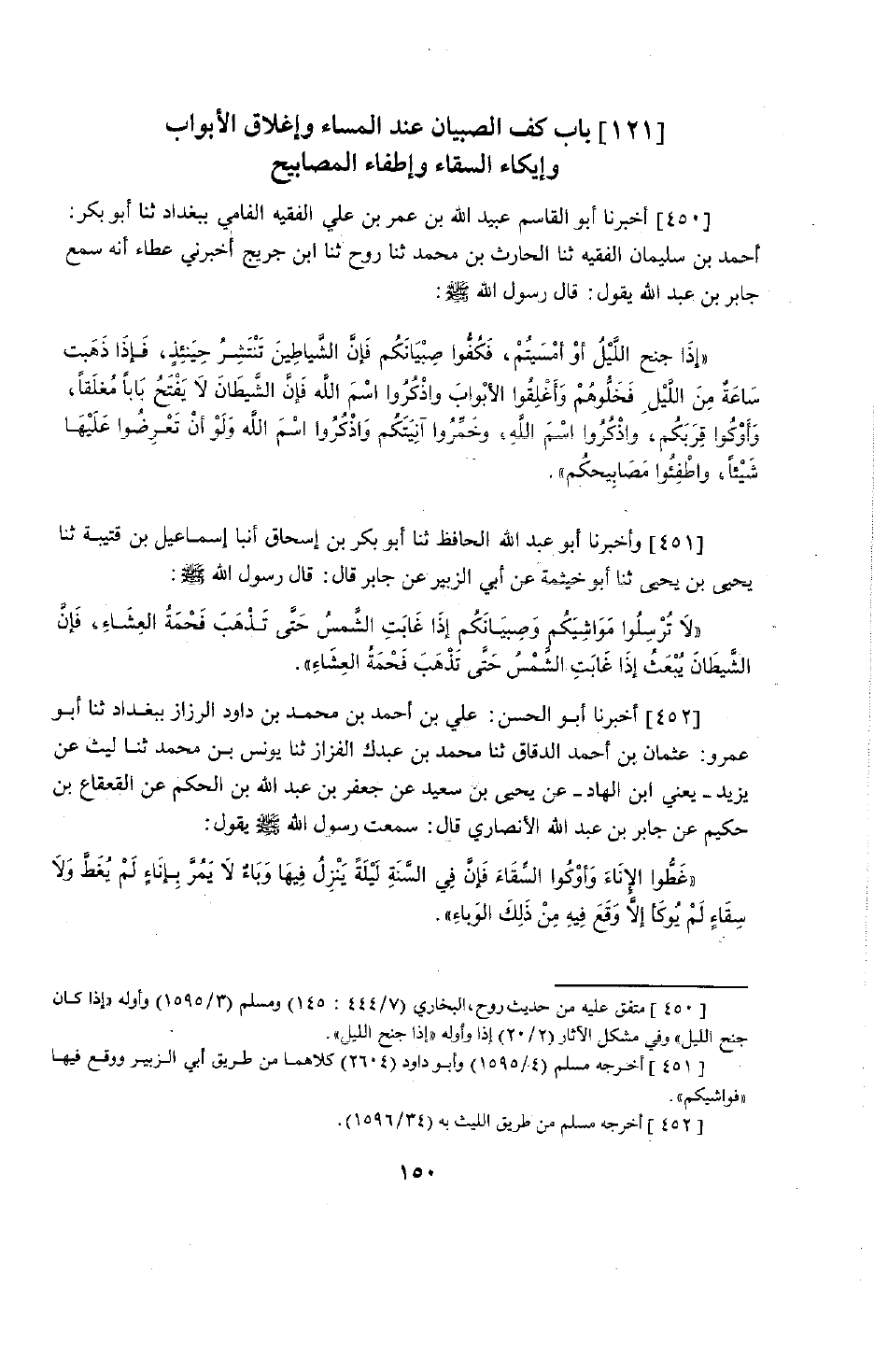 358 - أَخْبَرَنَا أَبُو الْقَاسِمِ عُبَيْدُ اللَّهِ بْنُ عُمَرَ بْنِ عَلِيٍّ الْفَقِيهُ الْفَامِيُّ بِبَغْدَادَ، حَدَّثَنَا أَبُو بَكْرٍ أَحْمَدُ بْنُ سَلْمَانَ الْفَقِيهُ، حَدَّثَنَا الْحَارِثُ بْنُ مُحَمَّدٍ، حَدَّثَنَا رَوْحٌ، حَدَّثَنَا ابْنُ جُرَيْجٍ، أَخْبَرَنِي عَطَاءٌ أَنَّهُ سَمِعَ جَابِرَ بْنَ عَبْدِ اللَّهِ يَقُولُ: قَالَ رَسُولُ اللَّهِ صَلَّى اللَّهُ عَلَيْهِ وَسَلَّمَ: §«إِذَا جَنَحَ اللَّيْلُ أَوْ أَمْسَيْتُمْ فَكُفُّوا صِبْيَانَكُمْ فَإِنَّ الشَّيَاطِينَ تَنْتَشِرُ حِينَئِذٍ، فَإِذَا ذَهَبَ سَاعَةٌ مِنَ اللَّيْلِ فَخَلُّوهُمْ، وَأَغْلِقُوا الْأَبْوَابَ وَاذْكُرُوا اسْمَ اللَّهِ فَإِنَّ الشَّيْطَانَ لَا يَفْتَحُ بَابًا مُغْلَقًا، وَأَوْكُوا قِرَبَكُمْ وَاذْكُرُوا اسْمَ اللَّهِ، وَخَمِّرُوا آنِيَتَكُمْ وَاذْكُرُوا اسْمَ اللَّهِ، وَلَوْ أَنْ تَعَرِضُوا عَلَيْهَا شَيْئًا، وَأَطْفِئُوا مَصَابِيحَكُمْ»