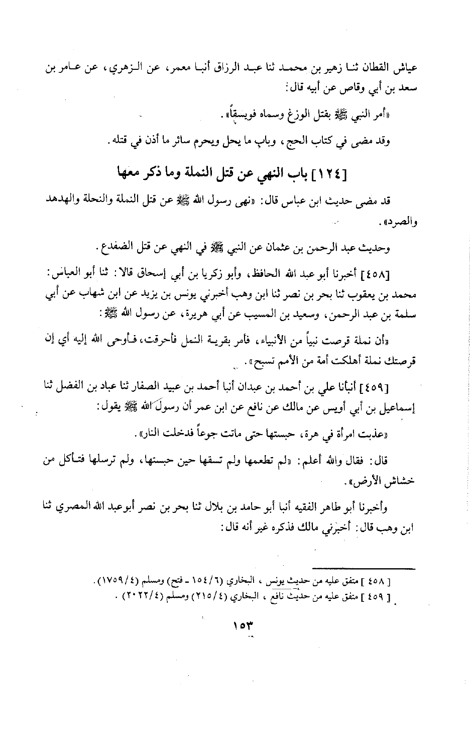 367 - أَنْبَأَنَا عَلِيُّ بْنُ أَحْمَدَ بْنِ عَبْدَانَ، أَنْبَأَنَا أَحْمَدُ بْنُ عُبَيْدٍ الصَّفَّارُ، حَدَّثَنَا عَبَّاسُ بْنُ الْفَضْلِ، حَدَّثَنَا إِسْمَاعِيلُ بْنُ أَبِي أُوَيْسٍ، عَنْ مَالِكٍ، عَنْ نَافِعٍ، عَنِ ابْنِ عُمَرَ أَنَّ رَسُولَ اللَّهِ صَلَّى اللَّهُ عَلَيْهِ وَسَلَّمَ قَالَ: «§عُذِّبَتِ امْرَأَةٌ فِي هِرَّةٍ، حَبَسَتْهَا حَتَّى مَاتَتْ جُوعًا فَدَخَلَتِ النَّارَ» قَالَ: فَقَالَ وَاللَّهُ أَعْلَمُ: «لَمْ تُطْعِمْهَا وَلَمْ تَسْقِهَا حِينَ حَبَسَتْهَا، وَلَمْ تُرْسِلْهَا فَتَأْكُلَ مِنْ خَشَاشِ الْأَرْضِ» . وَأَخْبَرَنَا أَبُو طَاهِرٍ الْفَقِيهُ، أَنْبَأَنَا أَبُو حَامِدِ بْنُ بِلَالٍ، حَدَّثَنَا بَحْرُ بْنُ نَصْرٍ أَبُو عَبْدِ اللَّهِ الْمِصْرِيُّ، حَدَّثَنَا وَهْبٌ قَالَ: أَخْبَرَنِي مَالِكٌ فَذَكَرَهُ، غَيْرَ أَنَّهُ قَالَ: -[154]- " وَيُقَالُ لَهَا وَاللَّهُ أَعْلَمُ: لَا أَنْتِ أَطْعَمْتِيهَا وَسَقَيْتِيهَا حِينَ حَبَسْتِيهَا، وَلَا أَنْتِ أَرْسَلْتِيهَا فَتَأْكُلُ مِنْ خَشَاشِ الْأَرْضِ حَتَّى مَاتَتْ جُوعًا " وَرُوِّينَا عَنْ زِيَادِ بْنِ عِلَاقَةَ، عَنْ عَمِّهِ قُطْبَةَ، وَعَنْ زِيَادِ بْنِ فَيَّاضٍ، عَنْ أَبِي عِيَاضٍ أَنَّهُمَا قَالَا: كَانَ يَكْرَهُ أَنْ يَقْتُلَ الرَّجُلُ مَا لَا يَضُرَّهُ