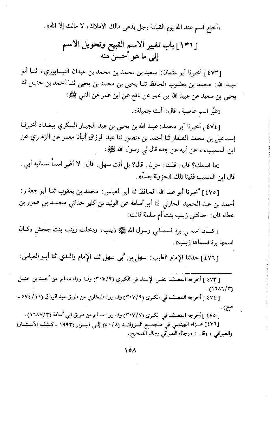 382 - حَدَّثَنَا الْإِمَامُ أَبُو الطَّيِّبِ سَهْلُ بْنُ أَبِي سَهْلٍ، حَدَّثَنَا الْإِمَامُ وَالِدِي، حَدَّثَنَا أَبُو الْعَبَّاسِ -[159]- مُحَمَّدُ بْنُ إِسْحَاقَ، حَدَّثَنَا مُحَمَّدُ بْنُ بَكَّارِ بْنِ الرَّيَّانِ، حَدَّثَنَا الْجَرَّاحُ بْنُ مَلِيحٍ أَبُو وَكِيعٍ، عَنْ أَبِي إِسْحَاقَ، عَنْ خَيْثَمَةَ بْنِ عَبْدِ الرَّحْمَنِ، عَنْ أَبِيهِ قَالَ: أَتَيْتُ مَعَ أَبِي النَّبِيَّ صَلَّى اللَّهُ عَلَيْهِ وَسَلَّمَ، فَقَالَ: «مَا اسْمُ ابْنِكَ هَذَا؟» فَقَالَ: عَزِيزٌ، فَقَالَ: «لَا تُسَمِّيهِ عَزِيزًا وَسَمِّهِ عَبْدَ الرَّحْمَنِ، فَإِنَّ §أَحَبَّ الْأَسْمَاءِ إِلَى اللَّهِ عَزَّ وَجَلَّ عَبْدُ الرَّحْمَنِ وَعَبْدُ اللَّهِ» . وَفِي هَذَا أَخْبَارٌ كَثِيرَةٌ يَطُولُ بِشَرْحِهَا الْكِتَابُ