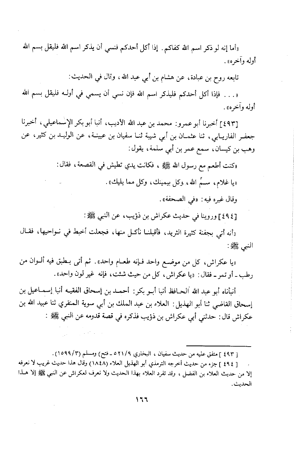 400 - وَرُوِّينَا فِي حَدِيثِ عِكْرَاشِ بْنِ ذُؤَيْبٍ عَنِ النَّبِيِّ صَلَّى اللَّهُ عَلَيْهِ وَسَلَّمَ أَنَّهُ أُتِيَ بِجَفْنَةٍ كَثِيرَةِ الثَّرِيدِ، فَأَقْبَلْنَا نَأْكُلُ مِنْهَا، فَجَعَلْتُ أَخْبِطُ فِي نَوَاحِيهَا، فَقَالَ النَّبِيُّ صَلَّى اللَّهُ عَلَيْهِ وَسَلَّمَ: «يَا عِكْرَاشُ، §كُلْ مِنْ مَوْضِعٍ وَاحِدٍ فَإِنَّهُ طَعَامٌ وَاحِدٌ» ثُمَّ أُتِيَ بِطَبَقٍ فِيهِ أَلْوَانٌ مِنْ رُطَبٍ أَوْ تَمْرٍ فَقَالَ: «يَا عِكْرَاشُ، كُلْ مِنْ حَيْثُ شِئْتَ، فَإِنَّهُ غَيْرُ لَوْنٍ وَاحِدٍ» . أَنْبَأَنَاهُ أَبُو عَبْدِ اللَّهِ الْحَافِظُ أَنْبَأَنَا أَبُو بَكْرٍ أَحْمَدُ بْنُ إِسْحَاقَ الْفَقِيهُ أَنْبَأَنَا إِسْمَاعِيلُ بْنُ إِسْحَاقَ الْقَاضِي، حَدَّثَنَا أَبُو الْهُذَيْلِ الْعَلَاءُ بْنُ عَبْدِ الْمَلِكِ بْنِ أَبِي سَوِيَّةَ الْمِنْقَرِيُّ، حَدَّثَنَا عُبَيْدُ اللَّهِ بْنُ عِكْرَاشٍ قَالَ: حَدَّثَنِي أَبِي عِكْرَاشُ بْنُ ذُؤَيْبٍ، فَذَكَرَهُ فِي قِصَّةِ قُدُومِهِ، عَنِ النَّبِيِّ صَلَّى اللَّهُ عَلَيْهِ وَسَلَّمَ