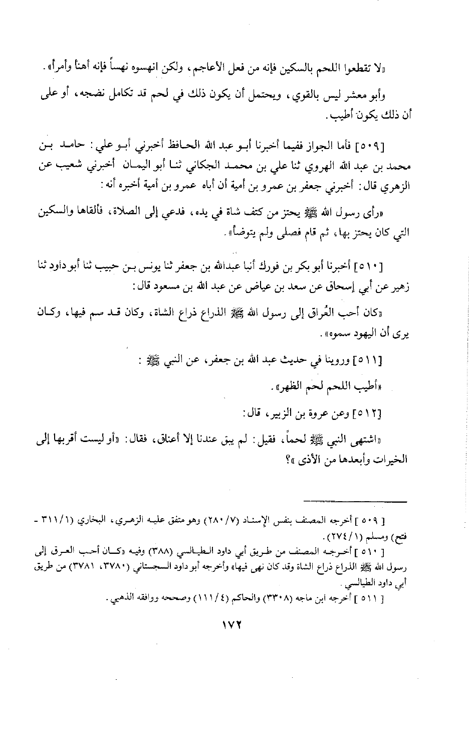 416 - أَخْبَرَنَا أَبُو بَكْرِ بْنُ فُورَكٍ، أَنْبَأَنَا عَبْدُ اللَّهِ بْنُ جَعْفَرٍ، حَدَّثَنَا يُونُسُ بْنُ حَبِيبٍ، حَدَّثَنَا أَبُو دَاوُدَ، حَدَّثَنَا زُهَيْرٌ، عَنْ أَبِي إِسْحَاقَ، عَنْ سَعِيدِ بْنِ عِيَاضٍ، عَنْ عَبْدِ اللَّهِ بْنِ مَسْعُودٍ قَالَ: كَانَ §أَحَبَّ الْعِرَاقِ إِلَى رَسُولِ اللَّهِ صَلَّى اللَّهُ عَلَيْهِ وَسَلَّمَ الذِّرَاعُ ذِرَاعُ الشَّاةِ، وَكَانَ قَدْ سُمَّ فِيهَا، وَكَانَ يَرَى أَنَّ الْيَهُودَ سَمُّوهُ. وَرُوِّينَا فِي حَدِيثِ عَبْدِ اللَّهِ بْنِ جَعْفَرٍ، عَنِ النَّبِيِّ صَلَّى اللَّهُ عَلَيْهِ وَسَلَّمَ «أَطْيَبُ اللَّحْمِ لَحْمُ الظَّهْرِ» . وَعَنْ عُرْوَةَ بْنِ الزُّبَيْرِ قَالَ: اشْتَهَى النَّبِيُّ صَلَّى اللَّهُ عَلَيْهِ وَسَلَّمَ لَحْمًا، فَقِيلَ لَمْ يَبْقَ عِنْدَنَا إِلَّا الْأَعْنَاقُ، فَقَالَ: «أَوَلَيْسَتْ أَقْرَبَهَا إِلَى الْخَيْرَاتِ وَأَبْعَدَهَا مِنَ الْأَذَى»