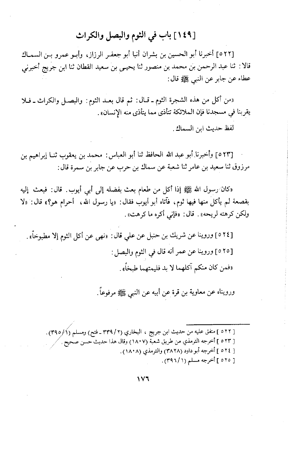 426 - أَخْبَرَنَا أَبُو الْحُسَيْنِ بْنُ بِشْرَانَ، أَنْبَأَنَا أَبُو جَعْفَرٍ الرَّزَّازُ وَأَبُو عَمْرِو بْنُ السَّمَّاكِ قَالَا: حَدَّثَنَا عَبْدُ الرَّحْمَنِ بْنُ مُحَمَّدِ بْنِ مَنْصُورٍ، حَدَّثَنَا يَحْيَى بْنُ سَعِيدٍ الْقَطَّانُ، حَدَّثَنَا ابْنُ جُرَيْجٍ، أَخْبَرَنِي عَطَاءٌ، عَنْ جَابِرٍ عَنِ النَّبِيِّ صَلَّى اللَّهُ عَلَيْهِ وَسَلَّمَ: قَالَ: " §مَنْ أَكَلَ مِنْ هَذِهِ الشَّجَرَةِ الثُّومَ قَالَ: ثُمَّ قَالَ بَعْدَ الثُّومِ: وَالْبَصَلَ وَالْكُرَّاثَ فَلَا يَقْرَبْنَا فِي مَسْجِدِنَا، فَإِنَّ الْمَلَائِكَةَ تَتَأَذَّى مِمَّا يَتَأَذَّى مِنْهُ الْإِنْسَانُ " لَفْظُ حَدِيثِ ابْنِ السَّمَّاكِ