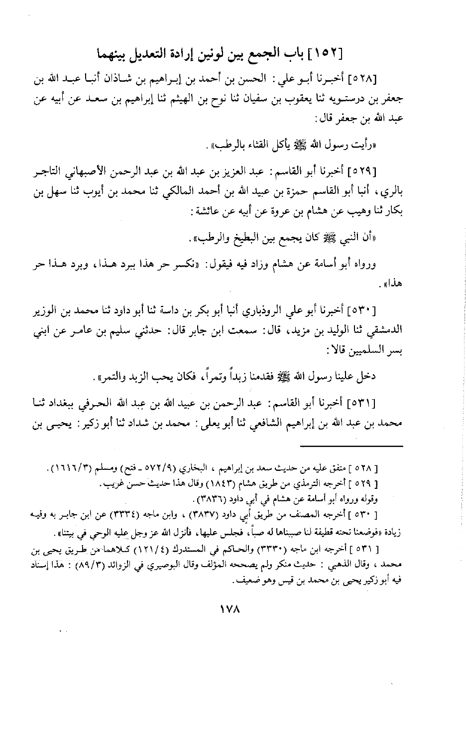 431 - أَخْبَرَنَا أَبُو الْقَاسِمِ عَبْدُ الْعَزِيزِ بْنُ عَبْدِ اللَّهِ بْنِ عَبْدِ الرَّحْمَنِ الْأَصْبَهَانِيُّ التَّاجِرُ، بِالرَّيِّ، أَنْبَأَنَا أَبُو الْقَاسِمِ حُمْرَةُ بْنُ عُبَيْدِ اللَّهِ بْنِ أَحْمَدَ الْمَالِكِيُّ، حَدَّثَنَا مُحَمَّدُ بْنُ أَيُّوبَ، حَدَّثَنَا سَهْلُ بْنُ بَكَّارٍ، حَدَّثَنَا وُهَيْبٌ، عَنْ هِشَامِ بْنِ عُرْوَةَ، عَنْ أَبِيهِ، عَنْ عَائِشَةَ: «أَنَّ النَّبِيَّ صَلَّى اللَّهُ عَلَيْهِ وَسَلَّمَ كَانَ §يَجْمَعُ بَيْنَ الْبِطِّيخِ وَالرُّطَبِ» وَرَوَاهُ أَبُو أُسَامَةَ، عَنْ هِشَامٍ، وَزَادَ فِيهِ، فَيَقُولُ: يَكْسِرُ حَرَّ هَذَا بِبَرْدِ هَذَا، وَبَرَدَ هَذَا حَرُّ هَذَا