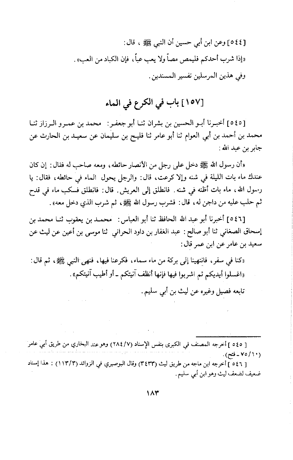 446 - أَخْبَرَنَا أَبُو عَبْدِ اللَّهِ الْحَافِظُ، حَدَّثَنَا أَبُو الْعَبَّاسِ مُحَمَّدُ بْنُ يَعْقُوبَ، حَدَّثَنَا مُحَمَّدُ بْنُ إِسْحَاقَ الصَّغَانِيُّ، حَدَّثَنَا أَبُو صَالِحٍ عَبْدُ الْغَفَّارِ بْنُ دَاوُدَ الْحَرَّانِيُّ، حَدَّثَنَا مُوسَى بْنُ أَعْيَنَ، عَنْ لَيْثٍ، عَنْ سَعِيدِ بْنِ عَامِرٍ، عَنِ ابْنِ عُمَرَ قَالَ: كُنَّا فِي سَفَرٍ، فَانْتَهَيْنَا إِلَى بِرْكَةٍ مِنْ مَاءِ سَمَاءٍ، فَكَرَعْنَا فِيهَا، فَنَهَى النَّبِيُّ صَلَّى اللَّهُ عَلَيْهِ وَسَلَّمَ، ثُمَّ قَالَ: §«اغْسِلُوا أَيْدِيَكُمْ ثُمَّ اشْرَبُوا فِيهَا فَإِنَّهَا أَنْظَفُ آنِيَتِكُمْ أَوْ أَطْيَبُ آنِيَتِكُمْ» تَابَعَهُ فُضَيْلٌ وَغَيْرُهُ، عَنْ لَيْثِ بْنِ أَبِي سُلَيْمٍ، -[184]- وَهَذَا فِي الْمَاءِ يَكُونُ فِي حَوْضٍ صَغِيرٍ أَوْ مُسْتَنْقَعٍ، فَإِذَا كَرَعَ فِيهِ أَرْسَلَ نَفَسَهُ فِيهِ فَيَمْنَعُ غَيْرَهُ مِنَ الشُّرْبِ مِنْهُ تَقَزُّزًا وَالْحَدِيثُ الْأَوَّلُ فِي الْمَاءِ الْجَارِي أَوْ فِي مَاءٍ كَثِيرٍ