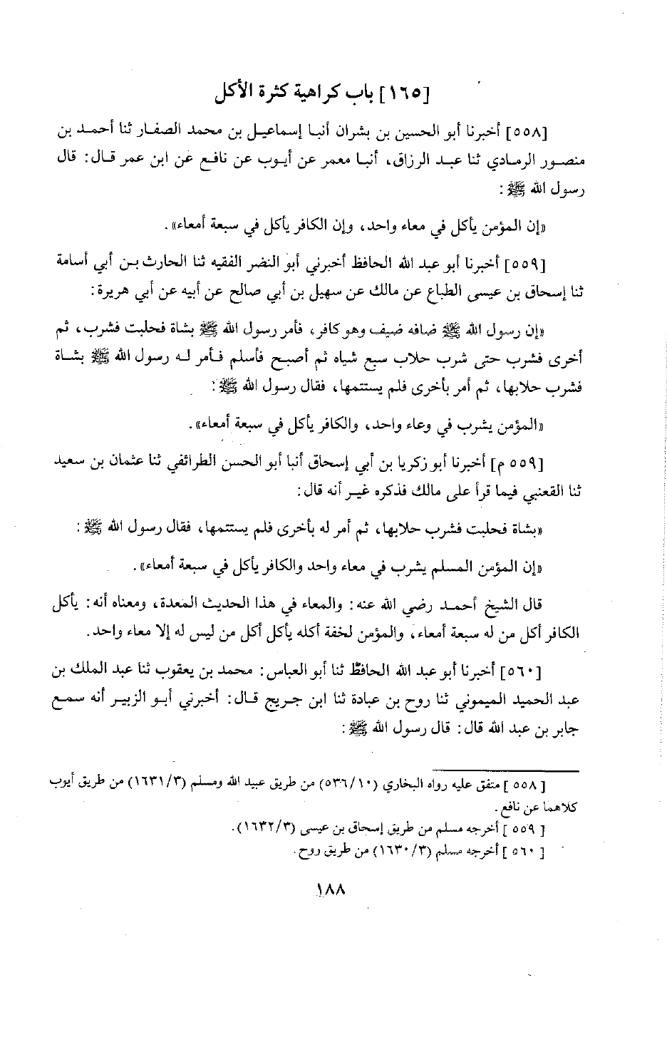 458 - أَخْبَرَنَا أَبُو عَبْدِ اللَّهِ الْحَافِظُ، أَخْبَرَنِي أَبُو النَّضْرِ الْفَقِيهُ، حَدَّثَنَا الْحَارِثُ بْنُ أَبِي أُسَامَةَ، حَدَّثَنَا إِسْحَاقُ بْنُ الطَّبَّاعِ، عَنْ مَالِكٍ عَنِ سُهَيْلِ بْنِ أَبِي صَالِحٍ، عَنْ أَبِيهِ، عَنْ أَبِي هُرَيْرَةَ: أَنَّ رَسُولَ اللَّهِ صَلَّى اللَّهُ عَلَيْهِ وَسَلَّمَ ضَافَهُ ضَيْفٌ وَهُوَ كَافِرٌ، فَأَمَرَ رَسُولُ اللَّهِ صَلَّى اللَّهُ عَلَيْهِ وَسَلَّمَ بِشَاةٍ فَحُلِبَتْ فَشَرِبَ، ثُمَّ أُخْرَى فَشَرِبَ حَتَّى شَرِبَ حِلَابَ سَبْعِ شِيَاهٍ، ثُمَّ أَصْبَحَ فَأَسْلَمَ فَأَمَرَ لَهُ رَسُولُ اللَّهِ صَلَّى اللَّهُ عَلَيْهِ وَسَلَّمَ بِشَاةٍ فَشَرِبَ حِلَابَهَا، ثُمَّ أَمَرَ بِأُخْرَى فَلَمْ يَسْتَتِمَّهَا، فَقَالَ رَسُولُ اللَّهِ صَلَّى اللَّهُ عَلَيْهِ وَسَلَّمَ: «§الْمُؤْمِنُ يَشْرَبُ فِي وِعَاءٍ وَاحِدٍ، وَالْكَافِرُ يَأْكُلُ فِي سَبْعَةِ أَمْعَاءٍ» . أَخْبَرَنَا أَبُو زَكَرِيَّا بْنُ أَبِي إِسْحَاقَ، أَنْبَأَنَا أَبُو الْحَسَنِ الطَّرَائِفِيُّ، حَدَّثَنَا عُثْمَانُ بْنُ سَعِيدٍ، حَدَّثَنَا الْقَعْنَبِيُّ، فِيمَا قَرَأَ عَلَى مَالِكٍ فَذَكَرَهُ غَيْرَ أَنَّهُ قَالَ: بِشَاةٍ فَحُلِبَتْ فَشَرِبَ حِلَابَهَا، ثُمَّ أَمَرَ لَهُ بِأُخْرَى فَلَمْ يَسْتَتِمَّهَا، فَقَالَ رَسُولُ اللَّهِ صَلَّى اللَّهُ عَلَيْهِ وَسَلَّمَ: «إِنَّ الْمُؤْمِنَ الْمُسْلِمَ يَشْرَبُ فِي مِعَاءٍ وَاحِدٍ وَالْكَافِرُ يَأْكُلُ فِي سَبْعَةِ أَمْعَاءٍ» . قَالَ الشَّيْخُ أَحْمَدُ رَضِيَ اللَّهُ عَنْهُ: وَالْمِعَاءُ فِي هَذَا الْحَدِيثِ الْمَعِدَةُ، وَمَعْنَاهُ أَنَّهُ: يَأْكُلُ الْكَافِرُ أَكْلَ مَنْ لَهُ سَبْعَةُ أَمْعَاءٍ، وَالْمُؤْمِنُ لِخِفَّةِ أَكْلِهِ يَأْكُلُ أَكْلَ مَنْ لَيْسَ لَهُ إِلَّا مِعَاءٌ وَاحِدٌ
