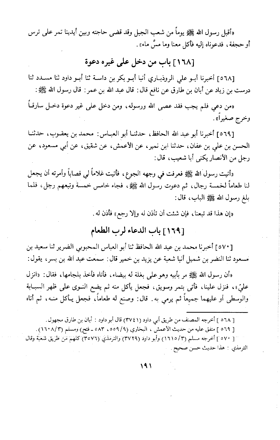 467 - أَخْبَرَنَا أَبُو عَلِيٍّ الرُّوذْبَارِيُّ، أَنْبَأَنَا أَبُو بَكْرِ بْنُ دَاسَةَ، أَنْبَأَنَا أَبُو دَاوُدَ، حَدَّثَنَا مُسَدَّدٌ، حَدَّثَنَا دُرُسْتُ بْنُ زِيَادٍ، عَنْ أَبَانَ بْنِ طَارِقٍ، عَنْ نَافِعٍ قَالَ: قَالَ عَبْدُ اللَّهِ بْنُ عُمَرَ: قَالَ رَسُولُ اللَّهِ صَلَّى اللَّهُ عَلَيْهِ وَسَلَّمَ: «§مَنْ دُعِيَ فَلَمْ يُجِبْ فَقَدْ عَصَى اللَّهَ وَرَسُولَهُ، وَمَنْ دَخَلَ عَلَى غَيْرِ دَعْوَةٍ دَخَلَ سَارِقًا وَخَرَجَ مُغِيرًا»