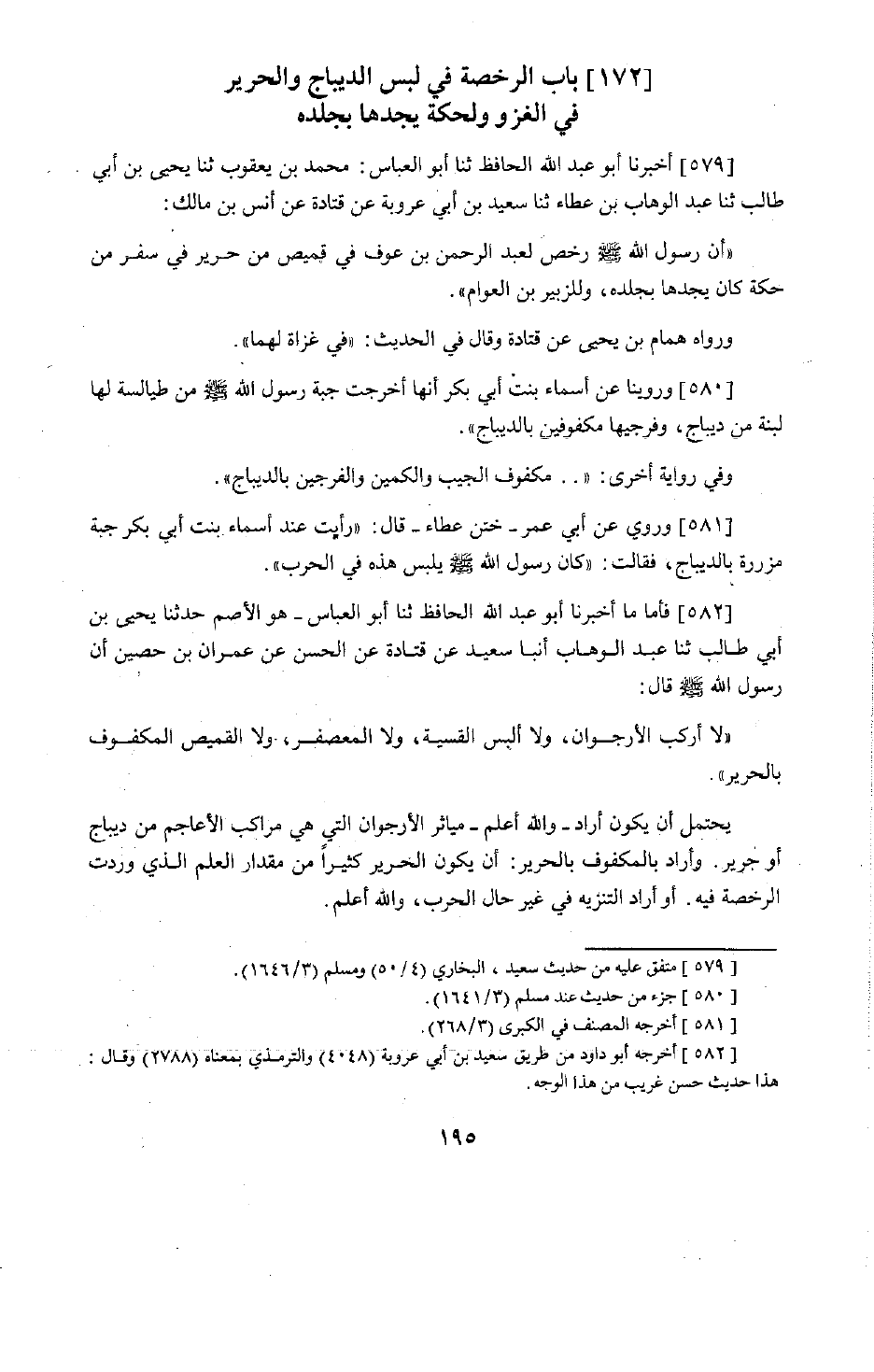 478 - أَخْبَرَنَا أَبُو عَبْدِ اللَّهِ الْحَافِظُ، حَدَّثَنَا أَبُو الْعَبَّاسِ مُحَمَّدُ بْنُ يَعْقُوبَ، حَدَّثَنَا يَحْيَى بْنُ أَبِي طَالِبٍ، حَدَّثَنَا عَبْدُ الْوَهَّابِ بْنُ عَطَاءٍ، حَدَّثَنَا سَعِيدُ بْنُ أَبِي عَرُوبَةَ، عَنْ قَتَادَةَ، عَنْ أَنَسِ بْنِ مَالِكٍ: أَنَّ رَسُولَ اللَّهِ صَلَّى اللَّهُ عَلَيْهِ وَسَلَّمَ §رَخَّصَ لِعَبْدِ الرَّحْمَنِ بْنِ عَوْفٍ فِي قَمِيصٍ مِنْ حَرِيرٍ فِي سَفَرٍ مِنْ حِكَّةٍ كَانَ يَجِدُهَا بِجِلْدِهِ، وَلِلزُّبَيْرِ بْنِ الْعَوَّامِ ". وَرَوَاهُ هَمَّامُ بْنُ يَحْيَى، عَنْ قَتَادَةَ، وَقَالَ فِي الْحَدِيثِ: «فِي غَزَاةٍ لَهُمَا» . وَرُوِّينَا عَنْ أَسْمَاءَ بِنْتِ أَبِي بَكْرٍ أَنَّهَا أَخْرَجَتْ جُبَّةَ رَسُولِ اللَّهِ صَلَّى اللَّهُ عَلَيْهِ وَسَلَّمَ مِنْ طَيَالِسَةٍ لَهَا لِبْسَةً مِنْ دِيبَاجٍ، وَفَرْجَيْهَا مَكْفُوفَيْنِ بِالدِّيبَاجِ. وَفِي رِوَايَةٍ أُخْرَى: مَكْفُوفَةُ الْجَيْبِ وَالْكُمَّيْنِ وَالْفَرْجَيْنِ بِالدِّيبَاجِ، وَرُوِيَ عَنْ أَبِي عُمَرَ، خَاتِنِ عَطَاءٍ قَالَ: رَأَيْتُ عِنْدَ أَسْمَاءَ بِنْتِ أَبِي بَكْرٍ جُبَّةً مُزَرَّرَةً بِالدِّيبَاجِ، فَقَالَتْ: كَانَ رَسُولُ اللَّهِ صَلَّى اللَّهُ عَلَيْهِ وَسَلَّمَ يَلْبَسُ هَذِهِ فِي الْحَرْبِ