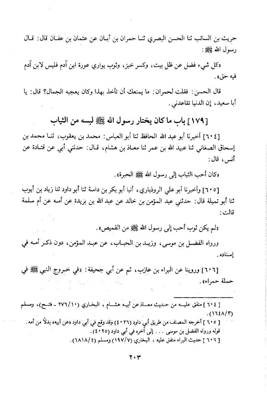 499 - وَأَخْبَرَنَا أَبُو عَلِيٍّ الرُّوذْبَارِيُّ، أَنْبَأَنَا أَبُو بَكْرِ بْنُ دَاسَةَ، حَدَّثَنَا أَبُو دَاوُدَ، حَدَّثَنَا زِيَادُ بْنُ أَيُّوبَ، حَدَّثَنَا أَبُو تُمَيْلَةَ قَالَ: حَدَّثَنِي عَبْدُ الْمُؤْمِنِ بْنُ خَالِدٍ، عَنْ عَبْدِ اللَّهِ بْنِ بُرَيْدَةَ، عَنْ أُمِّهِ، عَنْ أُمِّ سَلَمَةَ قَالَتْ: §«لَمْ يَكُنْ ثَوْبٌ أَحَبَّ إِلَى رَسُولِ اللَّهِ مِنَ الْقَمِيصِ» ، وَرَوَاهُ الْفَضْلُ بْنُ مُوسَى وَزَيْدُ بْنُ الْحُبَابِ، عَنْ عَبْدِ الْمُؤْمِنِ دُونَ ذِكْرِ أُمِّهِ فِي إِسْنَادِهِ. وَرُوِّينَا عَنِ الْبَرَاءِ بْنِ عَازِبٍ، ثُمَّ عَنْ أَبِي جُحَيْفَةَ: فِي خُرُوجِ النَّبِيِّ صَلَّى اللَّهُ عَلَيْهِ وَسَلَّمَ فِي حُلَّةٍ حَمْرَاءَ -[204]- وَالْحُلَّةُ: إِزَارٌ وَرِدَاءٌ وَلَا يَكُونُ فِيهَا قَزٌّ، وَفِي حَدِيثِ أَبِي رِمْثَةَ قَالَ: انْطَلَقْتُ نَحْوَ النَّبِيِّ صَلَّى اللَّهُ عَلَيْهِ وَسَلَّمَ، فَرَأَيْتُ عَلَيْهِ بُرْدَيْنِ أَخْضَرَيْنِ، وَفِي حَدِيثِ أَنَسِ بْنِ مَالِكٍ: كُنْتُ أَمْشِي مَعَ النَّبِيِّ صَلَّى اللَّهُ عَلَيْهِ وَسَلَّمَ وَعَلَيْهِ بُرْدٌ غَلِيظُ الْحَاشِيَةِ