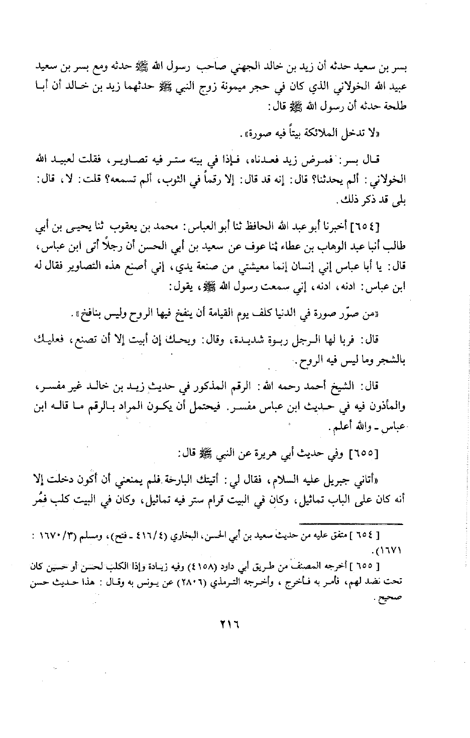 531 - أَخْبَرَنَا أَبُو عَبْدِ اللَّهِ الْحَافِظُ، حَدَّثَنَا أَبُو الْعَبَّاسِ مُحَمَّدُ بْنُ يَعْقُوبَ، حَدَّثَنَا يَحْيَى بْنُ أَبِي طَالِبٍ، أَنْبَأَنَا عَبْدُ الْوَهَّابِ بْنُ عَطَاءٍ، حَدَّثَنَا عَوْفٌ، عَنْ سَعِيدِ بْنِ أَبِي الْحَسَنِ أَنَّ رَجُلًا أَتَى ابْنَ عَبَّاسٍ قَالَ: يَا أَبَا عَبَّاسٍ إِنِّي إِنْسَانٌ إِنَّمَا مَعِيشَتِي مِنْ صَنْعَةِ يَدِي، إِنِّي أَصْنَعُ هَذِهِ التَّصَاوِيرَ، فَقَالَ لَهُ ابْنُ عَبَّاسٍ: ادْنُهْ، ادْنُهْ، إِنِّي سَمِعْتُ رَسُولَ اللَّهِ صَلَّى اللَّهُ عَلَيْهِ وَسَلَّمَ يَقُولُ: §«مَنْ صَوَّرَ صُورَةً فِي الدُّنْيَا كُلِّفَ يَوْمَ الْقِيَامَةِ أَنْ يَنْفُخَ فِيهَا الرُّوحَ وَلَيْسَ بِنَافِخٍ» قَالَ: فَرَبَى لَهَا الرَّجُلُ رَبْوَةً شَدِيدَةً، وَقَالَ: وَيْحَكَ أَنْ تَصْنَعَ، فَعَلَيْكَ بِالشَّجَرِ وَمَا لَيْسَ فِيهِ الرُّوحُ. قَالَ: الشَّيْخُ أَحْمَدُ رَحِمَهُ اللَّهُ: الرَّقْمُ الْمَذْكُورُ فِي حَدِيثِ زَيْدِ بْنِ خَالِدٍ غَيْرُ مُفَسَّرٍ، وَالْمَأْذُونُ فِيهِ فِي حَدِيثِ ابْنِ عَبَّاسٍ مُفَسَّرٌ، فَيُحْتَمَلُ أَنْ يَكُونَ الْمُرَادُ بِالرَّقْمِ مَا قَالَهُ ابْنُ عَبَّاسٍ وَاللَّهُ أَعْلَمُ