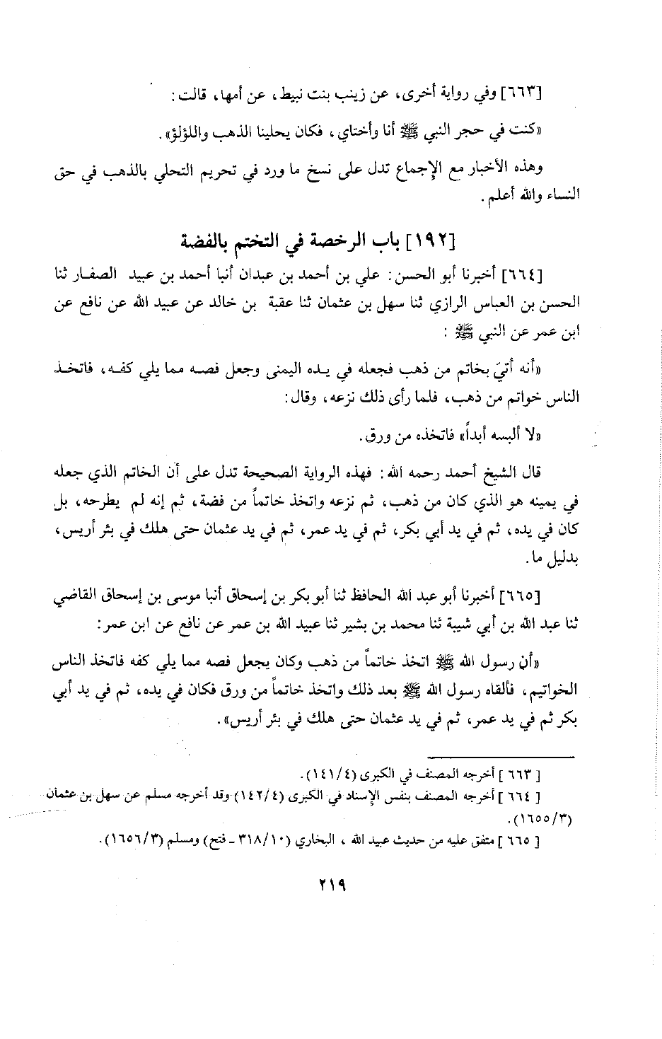 536 - أَخْبَرَنَا أَبُو الْحَسَنِ عَلِيُّ بْنُ أَحْمَدَ بْنِ عَبْدَانَ، أَنْبَأَنَا أَحْمَدُ بْنُ عُبَيْدٍ الصَّفَّارُ، حَدَّثَنَا الْحَسَنُ بْنُ الْعَبَّاسِ الرَّازِيُّ، حَدَّثَنَا سَهْلُ بْنُ عُثْمَانَ، حَدَّثَنَا عُقْبَةُ بْنُ خَالِدٍ، عَنْ عُبَيْدِ اللَّهِ، عَنْ نَافِعٍ، عَنِ ابْنِ عُمَرَ عَنِ النَّبِيِّ صَلَّى اللَّهُ عَلَيْهِ وَسَلَّمَ: " أَنَّهُ §أُتِيَ بِخَاتَمٍ مِنْ ذَهَبٍ فَجَعَلَهُ فِي يَدِهِ الْيُمْنَى وَجَعَلَ فَصَّهُ مِمَّا يَلِي كَفَّهُ، فَاتَّخَذَ النَّاسُ خَوَاتِمَ مِنْ ذَهَبٍ، فَلَمَّا رَأَى ذَلِكَ نَزَعَهُ، وَقَالَ: «لَا أَلْبَسُهُ أَبَدًا» فَاتَّخَذَهُ مِنْ وَرِقٍ. قَالَ الشَّيْخُ أَحْمَدُ رَحِمَهُ اللَّهُ: فَهَذِهِ الرِّوَايَةُ الصَّحِيحَةُ تَدُلُّ عَلَى أَنَّ الْخَاتَمَ الَّذِي جَعَلَهُ فِي يَمِينِهِ هُوَ الَّذِي كَانَ مِنْ ذَهَبٍ، ثُمَّ نَزَعَهُ وَاتَّخَذَ خَاتَمًا مِنْ فِضَّةٍ، ثُمَّ إِنَّهُ لَمْ يَطْرَحْهُ، بَلْ كَانَ فِي يَدِهِ، ثُمَّ فِي يَدِ أَبِي بَكْرٍ، ثُمَّ فِي يَدِ عُمَرَ، ثُمَّ فِي يَدِ عُثْمَانَ حَتَّى هَلَكَ فِي بِئْرِ أُرِيسٍ، بِدَلِيلِ