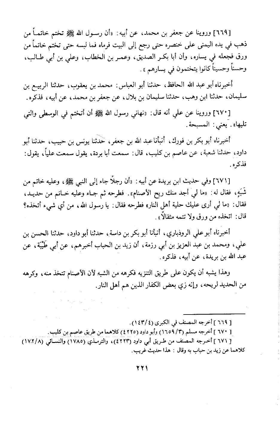 542 - وَرُوِّينَا عَنْ عَلِيٍّ أَنَّهُ قَالَ: §«نَهَانِي رَسُولُ اللَّهِ صَلَّى اللَّهُ عَلَيْهِ وَسَلَّمَ أَنْ أَتَخَتَّمَ فِي الْوُسْطَى وَالَّتِي تَلِيهَا يَعْنِي الْمُسَبِّحَةَ» . أَخْبَرَنَاهُ أَبُو بَكْرِ بْنُ فُورَكٍ، أَنْبَأَنَا عَبْدُ اللَّهِ بْنُ جَعْفَرٍ، حَدَّثَنَا يُونُسُ بْنُ حَبِيبٍ، حَدَّثَنَا أَبُو دَاوُدَ، حَدَّثَنَا شُعْبَةُ، عَنْ عَاصِمِ بْنِ كُلَيْبٍ قَالَ: سَمِعْتُ أَبَا بُرْدَةَ يَقُولُ: سَمِعْتُ عَلِيًّا يَقُولُ: فَذَكَرَهُ