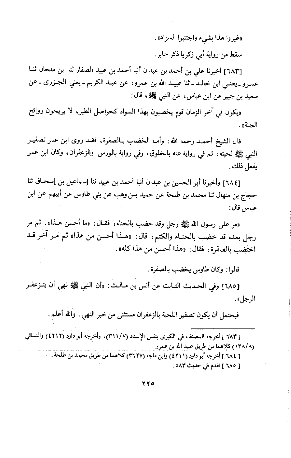 550 - أَخْبَرَنَا عَلِيُّ بْنُ أَحْمَدَ بْنِ عَبْدَانَ، أَنْبَأَنَا أَحْمَدُ بْنُ عُبَيْدٍ الصَّفَّارُ، حَدَّثَنَا ابْنُ مِلْحَانَ، حَدَّثَنَا عَمْرٌو يَعْنِي ابْنَ خَالِدٍ، حَدَّثَنَا عُبَيْدُ اللَّهِ بْنُ عَمْرٍو، عَنْ عَبْدِ الْكَرِيمِ يَعْنِي الْجَزَرِيَّ عَنْ سَعِيدِ بْنِ جُبَيْرٍ، عَنِ ابْنِ عَبَّاسٍ عَنِ النَّبِيِّ صَلَّى اللَّهُ عَلَيْهِ وَسَلَّمَ قَالَ: §«يَكُونُ فِي آخِرِ الزَّمَانِ قَوْمٌ يَخْضِبُونَ بِهَذَا السَّوَادِ كَحَوَاصِلِ الطَّيْرِ، لَا يَرِيحُونَ رَوَائِحَ الْجَنَّةِ» . قَالَ الشَّيْخُ أَحْمَدُ رَحِمَهُ اللَّهُ: وَأَمَّا الْخِضَابُ بِالصُّفْرَةِ، فَقَدْ رَوَى ابْنُ عُمَرَ تَصْفِيرُ النَّبِيِّ صَلَّى اللَّهُ عَلَيْهِ وَسَلَّمَ لِحْيَتَهُ، ثُمَّ فِي رِوَايَةٍ عَنْهُ بِالْخَلُوقِ، وَفِي رِوَايَةٍ بِالْوَرْسِ وَالزَّعْفَرَانِ، وَكَانَ ابْنُ عُمَرَ يَفْعَلُ ذَلِكَ