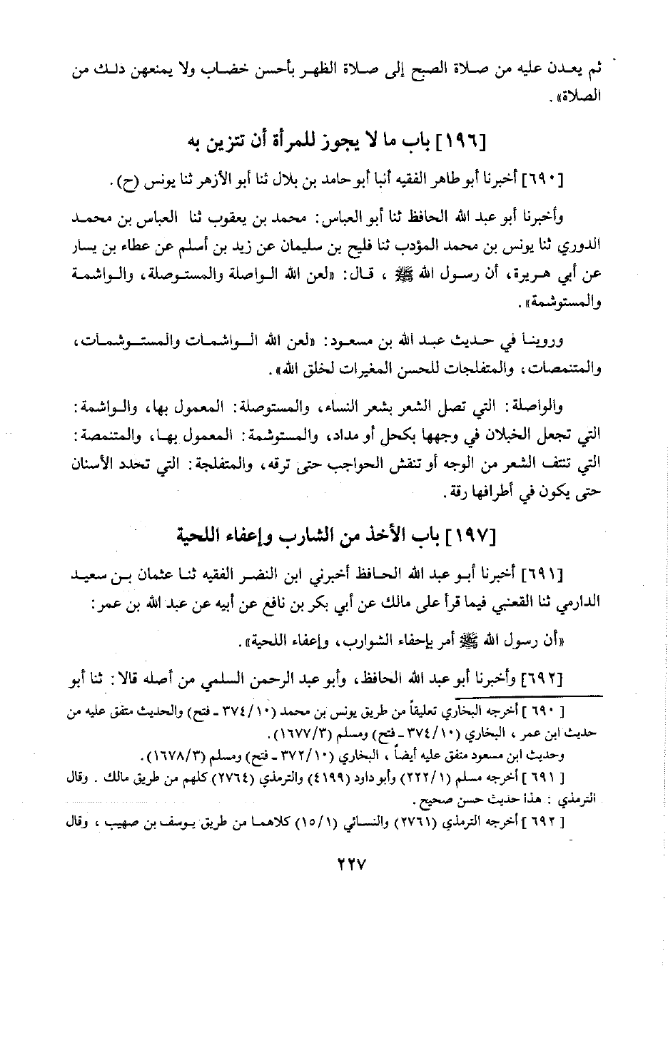 556 - أَخْبَرَنَا أَبُو طَاهِرٍ الْفَقِيهُ، أَنْبَأَنَا أَبُو حَامِدِ بْنُ بِلَالٍ، حَدَّثَنَا أَبُو الْأَزْهَرِ، حَدَّثَنَا يُونُسُ، ح وَأَخْبَرَنَا أَبُو عَبْدِ اللَّهِ الْحَافِظُ، حَدَّثَنَا أَبُو الْعَبَّاسِ مُحَمَّدُ بْنُ يَعْقُوبَ، حَدَّثَنَا الْعَبَّاسُ بْنُ مُحَمَّدٍ الدُّورِيُّ، حَدَّثَنَا يُونُسُ بْنُ مُحَمَّدٍ الْمُؤَدِّبُ، حَدَّثَنَا فُلَيْحُ بْنُ سُلَيْمَانَ، عَنْ زَيْدِ بْنِ أَسْلَمَ، عَنْ عَطَاءِ بْنِ يَسَارٍ، عَنْ أَبِي هُرَيْرَةَ أَنَّ رَسُولَ اللَّهِ صَلَّى اللَّهُ عَلَيْهِ وَسَلَّمَ قَالَ: §«لَعَنَ اللَّهُ الْوَاصِلَةَ وَالْمُسْتَوْصِلَةَ، وَالْوَاشِمَةَ وَالْمُسْتَوْشِمَةَ» . وَرُوِّينَا فِي حَدِيثِ عَبْدِ اللَّهِ بْنِ مَسْعُودٍ: «لَعَنَ اللَّهُ الْوَاشِمَاتِ وَالْمُسْتَوْشِمَاتِ، وَالْمُتَنَمِّصَاتِ، وَالْمُتَفَلِّجَاتِ لِلْحُسْنِ الْمُغَيِّرَاتِ لِخَلْقِ اللَّهِ» . وَالْوَاصِلَةُ: الَّتِي تَصِلُ بِشَعْرِ النِّسَاءِ، وَالْمُسْتَوْصِلَةُ: الْمَعْمُولُ بِهَا، وَالْوَاشِمَةُ: الَّتِي تَجْعَلُ الْخَبَلَانَ فِي وَجْهِهَا بِكُحْلٍ أَوْ مِدَادٍ، وَالْمُسْتَوْشِمَةُ: الْمَعْمُولُ بِهَا، وَالْمُتَنَمِّصَةُ: الَّتِي تَنْتِفُ الشَّعْرَ مِنَ الْوَجْهِ أَوْ تَنْقُشُ الْحَوَاجِبَ حَتَّى تُرِقَّهُ، وَالْمُتَفَلِّجَةُ: الَّتِي تُحَدِّدُ الْأَسْنَانَ حَتَّى يَكُونَ فِي أَطْرَافِهَا رِقَّةٌ