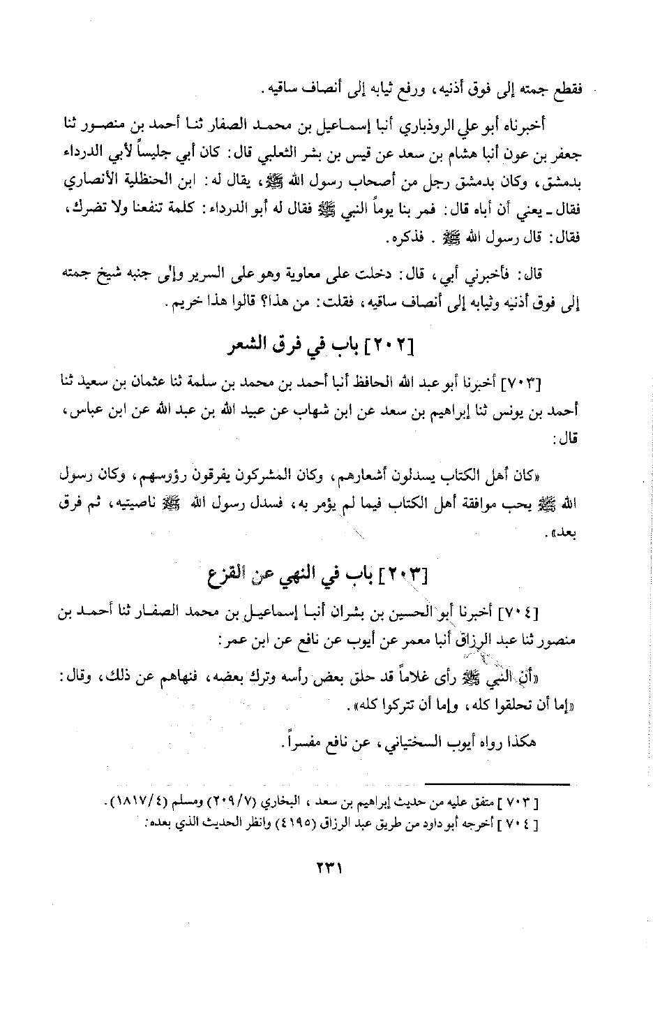 567 - أَخْبَرَنَا أَبُو الْحُسَيْنِ بْنُ بِشْرَانَ، أَنْبَأَنَا إِسْمَاعِيلُ بْنُ مُحَمَّدٍ الصَّفَّارُ، حَدَّثَنَا أَحْمَدُ بْنُ مَنْصُورٍ، حَدَّثَنَا عَبْدُ الرَّزَّاقِ، أَنْبَأَنَا مَعْمَرٌ، عَنْ أَيُّوبَ، عَنْ نَافِعٍ، عَنِ ابْنِ عُمَرَ: أَنَّ النَّبِيَّ صَلَّى اللَّهُ عَلَيْهِ وَسَلَّمَ رَأَى غُلَامًا قَدْ حَلَقَ بَعْضَ رَأْسِهِ وَتَرَكَ بَعْضَهُ، فَنَهَاهُمْ عَنْ ذَلِكَ، وَقَالَ: «§إِمَّا أَنْ تَحْلِقُوا كُلَّهُ، وَإِمَّا تَتْرُكُوا كُلَّهُ» . هَكَذَا رَوَاهُ أَيُّوبُ السَّخْتِيَانِيُّ، عَنْ نَافِعٍ مُفَسَّرًا