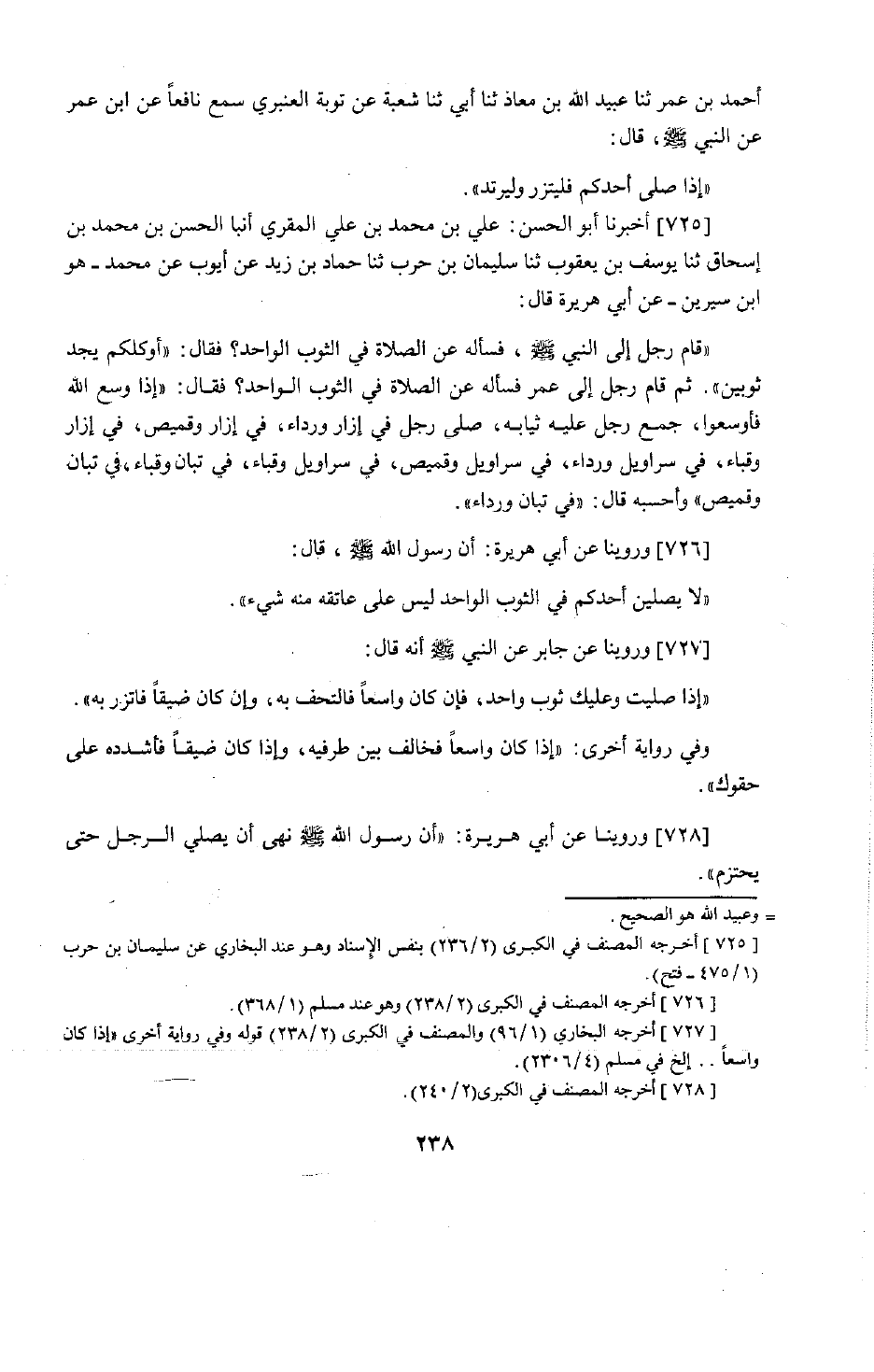 585 - أَخْبَرَنَا أَبُو الْحَسَنِ عَلِيُّ بْنُ مُحَمَّدِ بْنِ عَلِيٍّ الْمُقْرِئُ، أَنْبَأَنَا الْحَسَنُ بْنُ مُحَمَّدِ بْنِ إِسْحَاقَ، حَدَّثَنَا يُوسُفُ بْنُ يَعْقُوبَ، حَدَّثَنَا سُلَيْمَانُ بْنُ حَرْبٍ، حَدَّثَنَا حَمَّادُ بْنُ زَيْدٍ، عَنْ أَيُّوبَ، عَنْ مُحَمَّدٍ هُوَ ابْنُ سِيرِينَ، عَنْ أَبِي هُرَيْرَةَ قَالَ: قَامَ رَجُلٌ إِلَى النَّبِيِّ صَلَّى اللَّهُ عَلَيْهِ وَسَلَّمَ، فَسَأَلَهُ عَنِ الصَّلَاةِ فِي الثَّوْبِ الْوَاحِدِ؟ فَقَالَ: «أَوَ كُلُّكُمْ يَجِدُ ثَوْبَيْنِ» . ثُمَّ قَامَ رَجُلٌ إِلَى عُمَرَ فَسَأَلَهُ عَنِ الصَّلَاةِ فِي الثَّوْبِ الْوَاحِدِ؟ فَقَالَ: «§إِذَا وَسَّعَ اللَّهُ فَأَوْسِعُوا» ، جَمَعَ رَجُلٌ عَلَيْهِ ثِيَابَهُ، صَلَّى رَجُلٌ فِي إِزَارٍ، وَرِدَاءٍ فِي إِزَارٍ، وَقَمِيصٍ فِي إِزَارٍ، وَقَبَاءٍ فِي سَرَاوِيلَ، وَرِدَاءٍ فِي سَرَاوِيلَ، وَقَمِيصٍ فِي سَرَاوِيلَ، وَقَبَاءٍ فِي تُبَّانٍ، وَقَبَاءٍ فِي تُبَّانٍ وَقَمِيصٍ ". وَأَحْسِبُهُ قَالَ: «فِي تُبَّانٍ وَرِدَاءٍ» . وَرُوِّينَا عَنْ أَبِي هُرَيْرَةَ: أَنَّ رَسُولَ اللَّهِ صَلَّى اللَّهُ عَلَيْهِ وَسَلَّمَ قَالَ: «لَا يُصَلِّيَنَّ أَحَدُكُمْ فِي الثَّوْبِ الْوَاحِدِ لَيْسَ عَلَى عَاتِقِهِ مِنْهُ شَيْءٌ» . وَرُوِّينَا عَنْ جَابِرٍ عَنِ النَّبِيِّ صَلَّى اللَّهُ عَلَيْهِ وَسَلَّمَ، أَنَّهُ قَالَ: «إِذَا صَلَّيْتَ وَعَلَيْكَ ثَوْبٌ وَاحِدٌ، فَإِنْ كَانَ وَاسِعًا فَالْتَحِفْ بِهِ، وَإِنْ كَانَ ضَيِّقًا فَأَتَزِرْ بِهِ» . وَفِي رِوَايَةٍ أُخْرَى: إِذَا كَانَ وَاسِعًا فَخَالِفْ بَيْنَ طَرَفَيْهِ، وَإِذَا كَانَ ضَيِّقًا فَاشْدُدْهُ عَلَى حَقْوِكَ. وَرُوِّينَا عَنْ أَبِي هُرَيْرَةَ: أَنَّ رَسُولَ اللَّهِ صَلَّى اللَّهُ عَلَيْهِ وَسَلَّمَ نَهَى أَنْ يُصَلِّيَ الرَّجُلُ حَتَّى يَحْتَزِمَ "، -[239]- وَفِي حَدِيثٍ رُوِيَ عَنْ سَلَمَةَ بْنِ الْأَكْوَعِ، قُلْتُ: يَا رَسُولَ اللَّهِ، أُصَلِّي فِي الْقَمِيصِ الْوَاحِدِ؟ قَالَ: «نَعَمْ، وِزِرْهُ وَلَوْ بِشَوْكَةٍ»