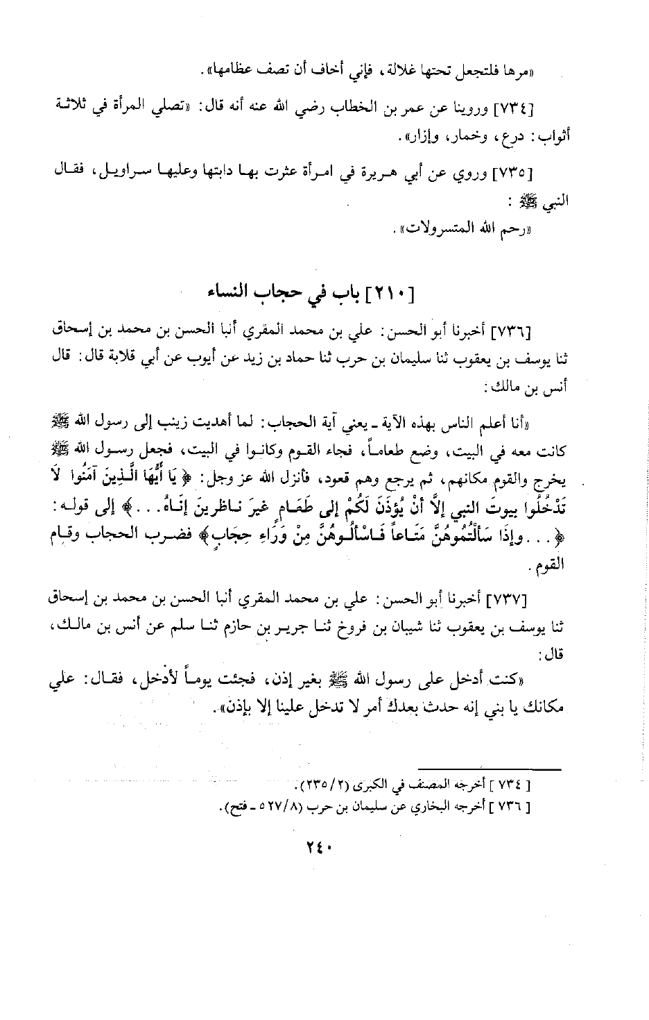 587 - أَخْبَرَنَا أَبُو الْحَسَنِ عَلِيُّ بْنُ مُحَمَّدٍ الْمُقْرِئُ، أَنْبَأَنَا الْحَسَنُ بْنُ مُحَمَّدِ بْنِ إِسْحَاقَ، حَدَّثَنَا يُوسُفُ بْنُ يَعْقُوبَ، حَدَّثَنَا سُلَيْمَانُ بْنُ حَرْبٍ، حَدَّثَنَا حَمَّادُ بْنُ زَيْدٍ، عَنْ أَيُّوبَ، عَنْ أَبِي قِلَابَةَ قَالَ: قَالَ أَنَسُ بْنُ مَالِكٍ: " أَنَا أَعْلَمُ بِهَذِهِ الْآيَةِ يَعْنِي آيَةَ الْحِجَابِ: §لَمَّا أُهْدِيَتْ زَيْنَبُ إِلَى رَسُولِ اللَّهِ صَلَّى اللَّهُ عَلَيْهِ وَسَلَّمَ كَانَتْ مَعَهُ فِي الْبَيْتِ، وَضَعَ طَعَامًا فَجَاءَ الْقَوْمُ وَكَانُوا فِي الْبَيْتِ، فَجَعَلَ رَسُولُ اللَّهِ صَلَّى اللَّهُ عَلَيْهِ وَسَلَّمَ يَخْرُجُ وَالْقَوْمُ مَكَانَهُمْ، ثُمَّ يَرْجِعُ وَهُمْ قُعُودٌ، فَأَنْزَلَ اللَّهُ عَزَّ وَجَلَّ: {يَا أَيُّهَا الَّذِينَ آمَنُوا لَا تَدْخُلُوا بُيُوتَ النَّبِيِّ إِلَّا أَنْ يُؤْذَنَ لَكُمْ إِلَى طَعَامٍ غَيْرَ نَاظِرِينَ إِنَاهُ. . . . .} [الأحزاب: 53] إِلَى قَوْلِهِ: {. وَإِذَا سَأَلْتُمُوهُنَّ مَتَاعًا فَاسْأَلُوهُنَّ مِنْ وَرَاءِ حِجَابٍ} [الأحزاب: 53] . فَضُرِبَ الْحِجَابُ وَقَامَ الْقَوْمُ "