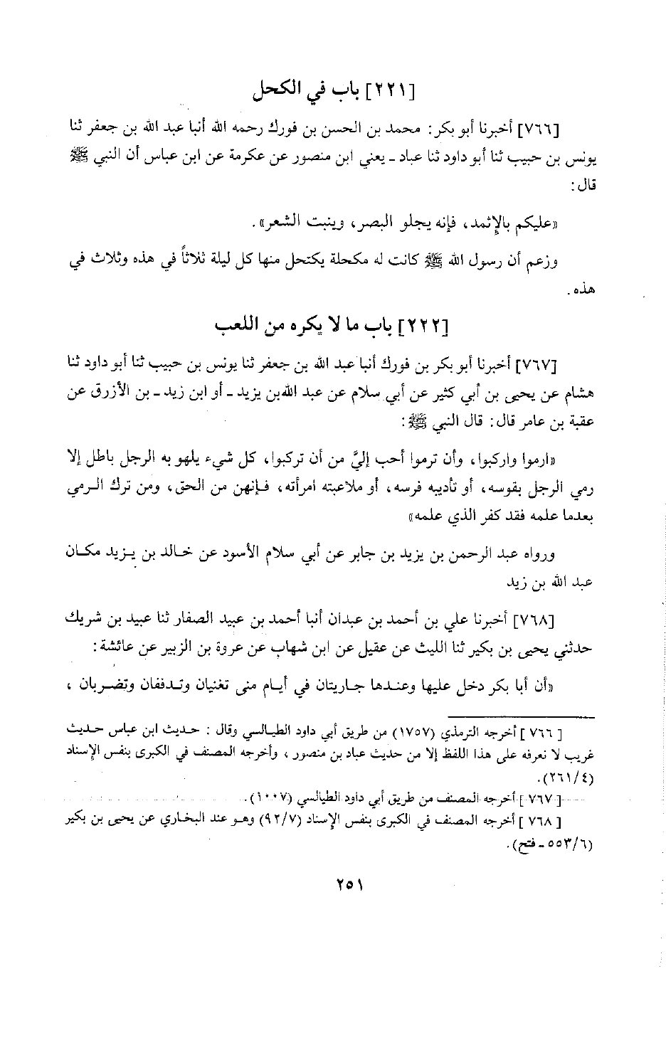 613 - أَخْبَرَنَا أَبُو بَكْرٍ مُحَمَّدُ بْنُ الْحَسَنِ بْنِ فُورَكٍ رَحِمَهُ اللَّهُ أَنْبَأَنَا عَبْدُ اللَّهِ بْنُ جَعْفَرٍ، حَدَّثَنَا يُونُسُ بْنُ حَبِيبٍ، حَدَّثَنَا أَبُو دَاوُدَ، حَدَّثَنَا عَبَّادٌ يَعْنِي ابْنَ مَنْصُورٍ، عَنْ عِكْرِمَةَ، عَنِ ابْنِ عَبَّاسٍ أَنَّ النَّبِيَّ صَلَّى اللَّهُ عَلَيْهِ وَسَلَّمَ قَالَ: «§عَلَيْكُمْ بِالْإِثْمِدِ، فَإِنَّهُ يَجْلُو الْبَصَرَ، وَيُنْبِتُ الشَّعْرَ» . وَزَعَمَ أَنَّ رَسُولَ اللَّهِ صَلَّى اللَّهُ عَلَيْهِ وَسَلَّمَ كَانَتْ لَهُ مُكْحُلَةٌ يَكْتَحِلُ مِنْهَا كُلَّ لَيْلَةٍ ثَلَاثًا فِي هَذِهِ وَثَلَاثًا فِي هَذِهِ