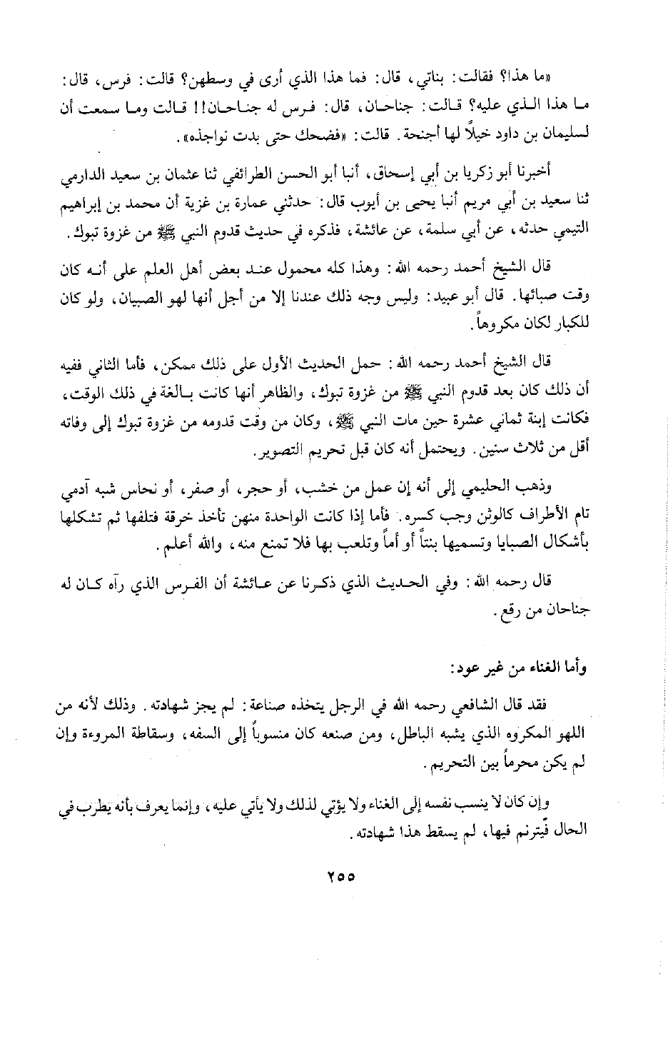 §وَأَمَّا الْغِنَاءُ مِنْ غَيْرِ عُودٍ فَقَدْ قَالَ الشَّافِعِيُّ رَحِمَهُ اللَّهُ فِي الرَّجُلِ يَتَّخِذُهُ صِنَاعَةً: لَمْ تَجُزْ شَهَادَتُهُ. وَذَلِكَ لِأَنَّهُ مِنَ اللَّهْوِ الْمَكْرُوهِ الَّذِي يُشْبِهُ الْبَاطِلَ، وَمَنْ صَنَعَهُ كَانَ مَنْسُوبًا إِلَى السَّفَهِ، وَسَقَاطَةِ الْمُرُوءَةِ وَإِنْ لَمْ يَكُنْ مُحَرَّمًا بَيِّنَ التَّحْرِيمِ. وَإِنْ كَانَ لَا يَنْسِبُ نَفْسَهُ إِلَى الْغِنَاءِ وَلَا يُؤْتِي لِذَلِكَ وَلَا يَأْتِي عَلَيْهِ، وَإِنَّمَا يُعْرَفُ بِأَنَّهُ يُطْرِبُ فِي الْحَالِ فَيَتَرَنَّمُ فِيهَا، لَمْ يُسْقِطْ هَذَا شَهَادَتَهُ.