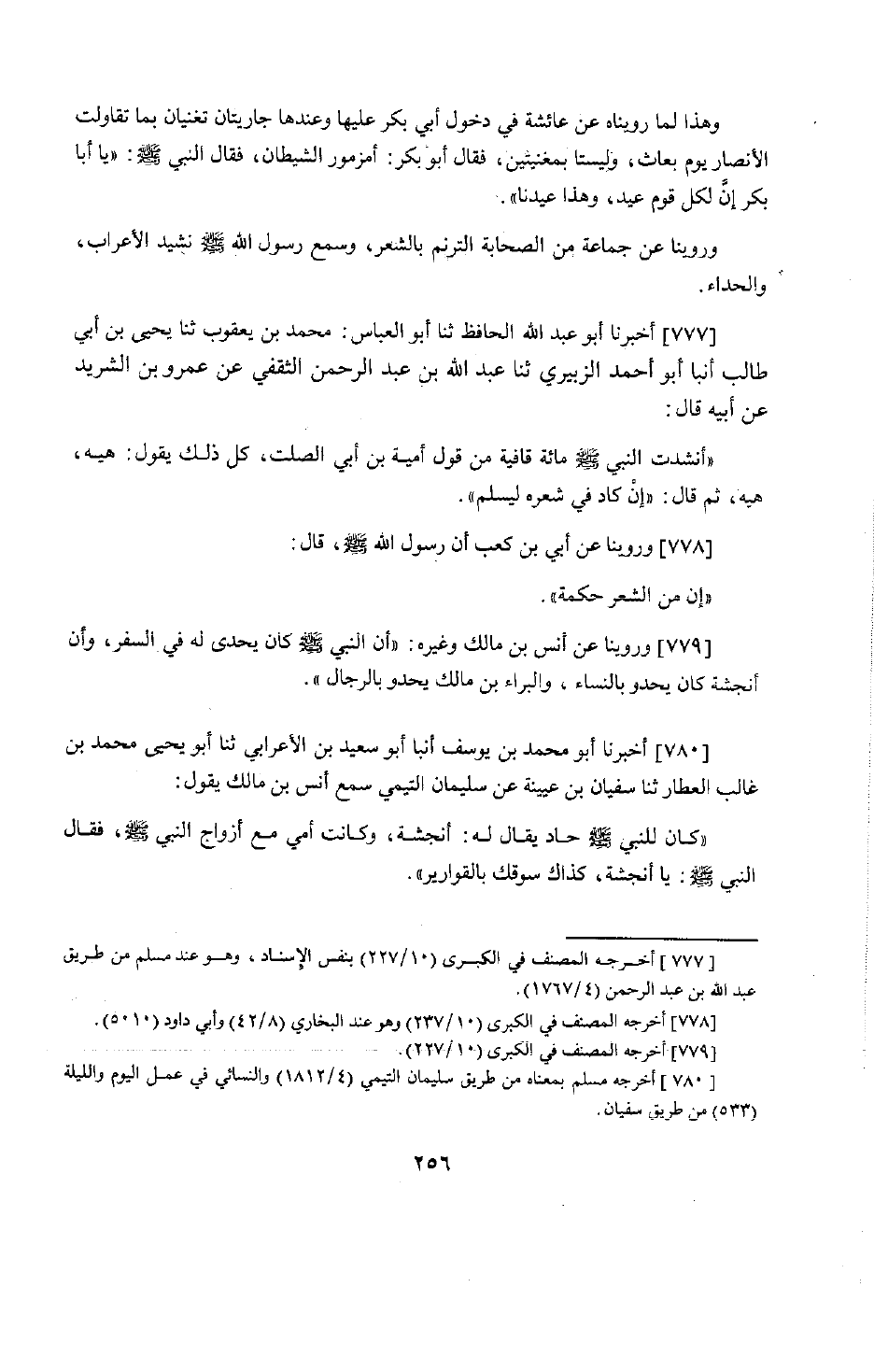 وَهَذَا لِمَا رُوِّينَاهُ عَنْ عَائِشَةَ فِي دُخُولِ أَبِي بَكْرٍ عَلَيْهَا وَعِنْدَهَا جَارِيَتَانِ تُغَنِّيَانِ بِمَا تَقَاوَلَتِ الْأَنْصَارُ يَوْمَ بُعَاثٍ، وَلَيْسَتَا بِمُغَنِّيَتَيْنِ، فَقَالَ أَبُو بَكْرٍ: أَمَزْمُورُ الشَّيْطَانِ، فَقَالَ النَّبِيُّ صَلَّى اللَّهُ عَلَيْهِ وَسَلَّمَ: «يَا أَبَا بَكْرٍ، لِكُلِّ قَوْمٍ عِيدٌ، وَهَذَا عِيدُنَا» ، وَرُوِّينَا عَنْ جَمَاعَةٍ مِنَ الصَّحَابَةِ التَّرَنُّمَ بِالشِّعْرِ، وَسَمِعَ رَسُولُ اللَّهِ صَلَّى اللَّهُ عَلَيْهِ وَسَلَّمَ نَشِيدَ الْأَعْرَابِ، وَالْحُدَاءَ.