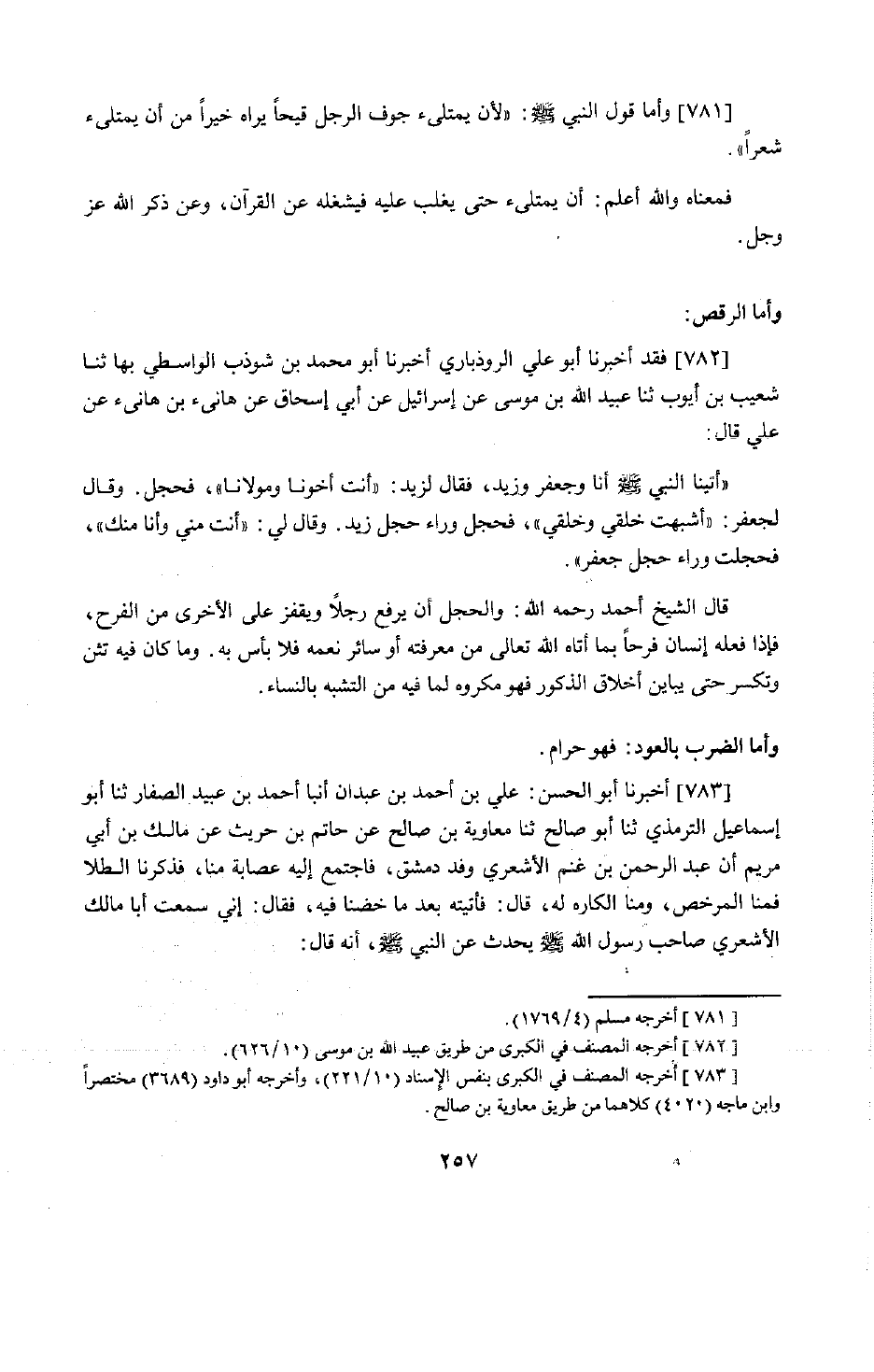 626 - فَقَدْ أَخْبَرَنَا أَبُو عَلِيٍّ الرُّوذْبَارِيُّ، أَخْبَرَنَا أَبُو مُحَمَّدِ بْنُ شَوْذَبٍ الْوَاسِطِيُّ، حَدَّثَنَا شُعَيْبُ بْنُ أَيُّوبَ، حَدَّثَنَا عُبَيْدُ اللَّهِ بْنُ مُوسَى، عَنْ إِسْرَائِيلَ، عَنْ أَبِي إِسْحَاقَ، عَنْ هَانِئِ بْنِ هَانِئٍ، عَنْ عَلِيٍّ قَالَ: أَتَيْنَا النَّبِيَّ صَلَّى اللَّهُ عَلَيْهِ وَسَلَّمَ أَنَا وَجَعْفَرٌ وَزَيْدٌ، فَقَالَ لِزَيْدٍ: «§أَنْتَ أَخُونَا وَمَوْلَانَا» ، فَحَجَلَ. وَقَالَ لِجَعْفَرٍ: «أَشْبَهْتَ خَلْقِي وَخُلُقِي» ، فَحَجَلَ وَرَاءَ حَجَلِ زَيْدٍ. وَقَالَ لِي: «أَنْتَ مِنِّي وَأَنَا مِنْكَ» ، فَحَجَلْتُ وَرَاءَ حَجَلِ جَعْفَرٍ. قَالَ الشَّيْخُ أَحْمَدُ رَحِمَهُ اللَّهُ: وَالْحَجَلُ أَنْ يَرْفَعَ رِجْلًا وَيَقْفِزَ عَلَى الْأُخْرَى مِنَ الْفَرَحِ، فَإِذَا فَعَلَهُ إِنْسَانٌ فَرَحًا بِمَا أَتَاهُ اللَّهُ تَعَالَى مِنْ مَعْرِفَتِهِ أَوْ سَائِرِ نِعَمِهِ فَلَا بَأْسَ بِهِ. وَمَا كَانَ فِيهِ تَثَنٍّ وَتَكَسُّرٍ حَتَّى يُبَايِنَ أَخْلَاقَ الذُّكُورِ فَهُوَ مَكْرُوهٌ لِمَا فِيهِ مِنَ التَّشَبُّهِ بِالنِّسَاءِ