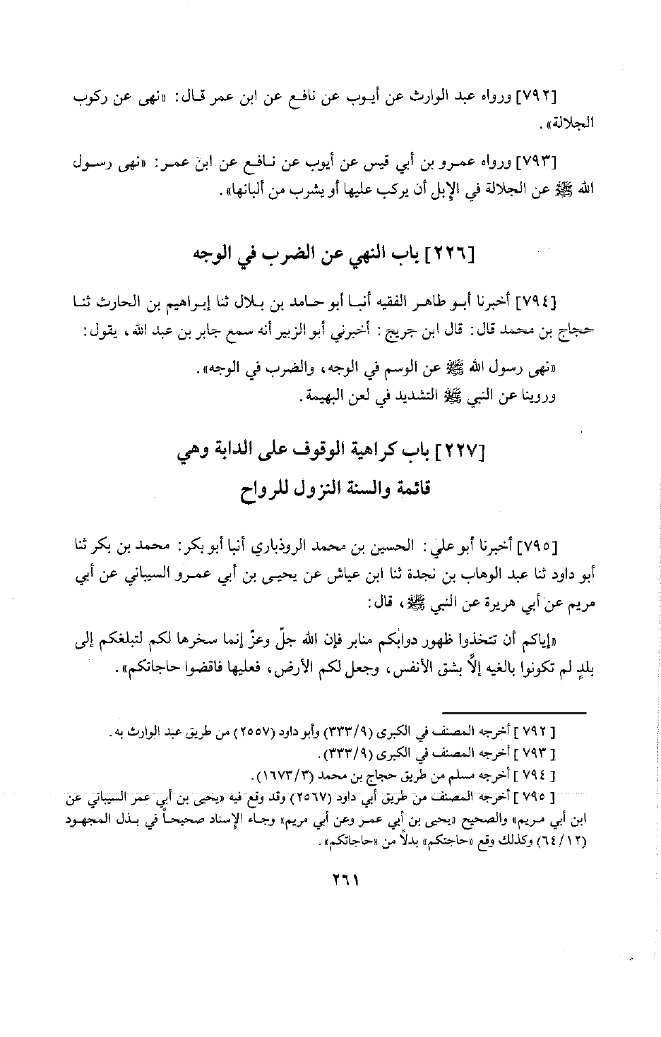 637 - أَخْبَرَنَا أَبُو طَاهِرٍ الْفَقِيهُ، أَنْبَأَنَا أَبُو حَامِدِ بْنُ بِلَالٍ، حَدَّثَنَا إِبْرَاهِيمُ بْنُ الْحَارِثِ، حَدَّثَنَا حَجَّاجُ بْنُ مُحَمَّدٍ قَالَ: قَالَ جُرَيْجٌ: أَخْبَرَنِي أَبُو الزُّبَيْرِ أَنَّهُ سَمِعَ جَابِرَ بْنَ عَبْدِ اللَّهِ يَقُولُ: §" نَهَى رَسُولُ اللَّهِ صَلَّى اللَّهُ عَلَيْهِ وَسَلَّمَ عَنِ الْوَشْمِ فِي الْوَجْهِ، وَالضَّرْبِ فِي الْوَجْهِ. وَرُوِّينَا عَنِ النَّبِيِّ صَلَّى اللَّهُ عَلَيْهِ وَسَلَّمَ التَّشْدِيدَ فِي لَعْنِ النَّاقَةِ - الْبَهِيمَةِ -