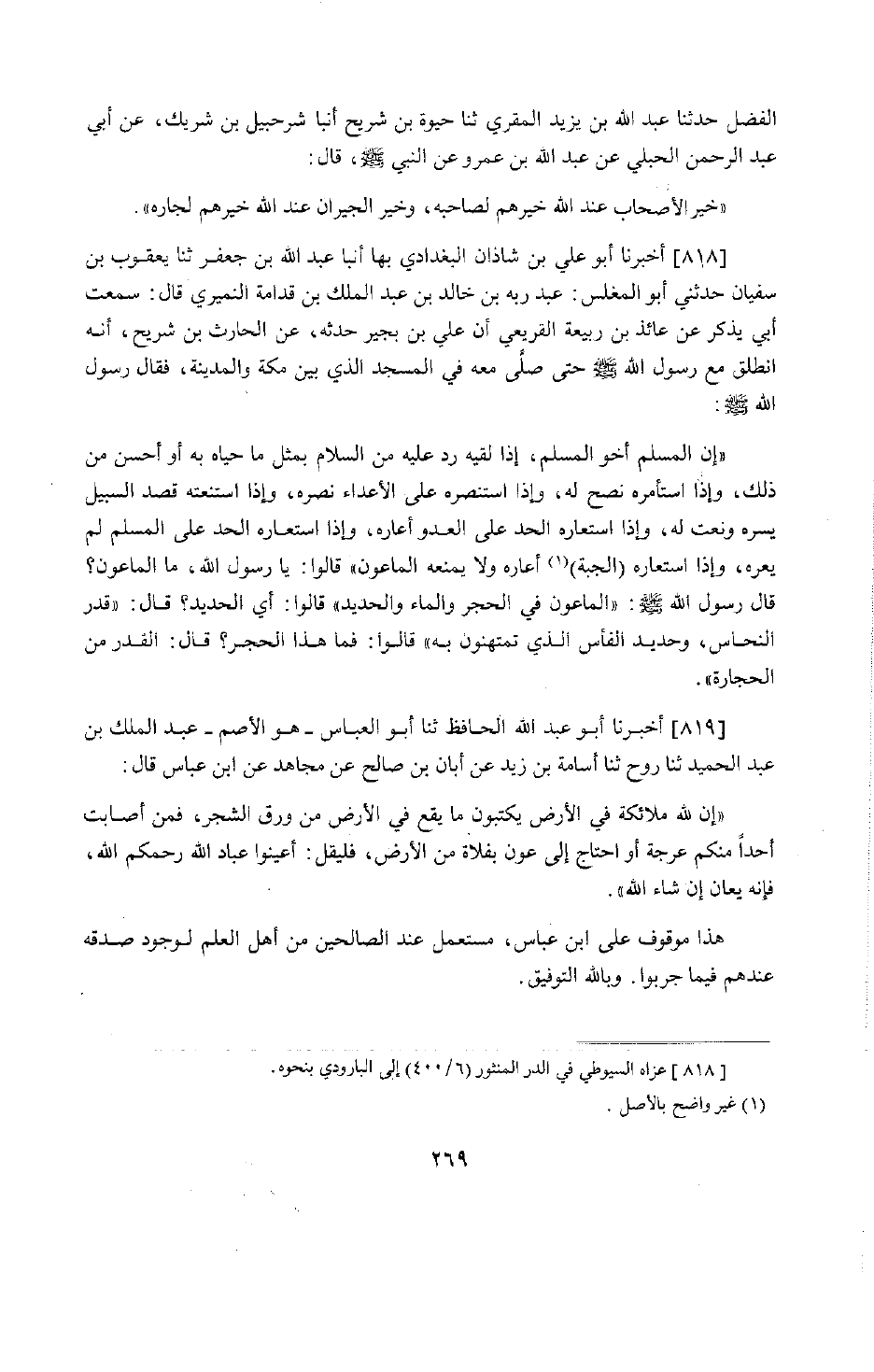 656 - أَخْبَرَنَا أَبُو عَلِيِّ بْنُ شَاذَانَ الْبَغْدَادِيُّ بِهَا، أَنْبَأَنَا عَبْدُ اللَّهِ بْنُ جَعْفَرٍ، حَدَّثَنَا يَعْقُوبُ بْنُ سُفْيَانَ، حَدَّثَنِي أَبُو الْمُغَلِّسِ عَبْدُ رَبِّهِ بْنُ خَالِدِ بْنِ عَبْدِ الْمَلِكِ بْنِ قُدَامَةَ النُّمَيْرِيُّ قَالَ: سَمِعْتُ أَبِي يَذْكُرُ، عَنْ عَائِذِ بْنِ رَبِيعَةَ الْقُرَيْعِيِّ أَنَّ عَلِيَّ بْنَ بُجَيْرٍ، حَدَّثَهُ، عَنِ الْحَارِثِ بْنِ شُرَيْحٍ أَنَّهُ انْطَلَقَ مَعَ رَسُولِ اللَّهِ صَلَّى اللَّهُ عَلَيْهِ وَسَلَّمَ حَتَّى صَلَّى مَعَهُ فِي الْمَسْجِدِ الَّذِي بَيْنَ مَكَّةَ وَالْمَدِينَةَ فَقَالَ رَسُولُ اللَّهِ صَلَّى اللَّهُ عَلَيْهِ وَسَلَّمَ: «إِنَّ §الْمُسْلِمَ أَخُو الْمُسْلِمِ، إِذَا لَقِيَهُ رَدَّ عَلَيْهِ مِنَ السَّلَامِ بِمِثْلِ مَا حَيَّاهُ بِهِ أَوْ أَحْسَنَ مِنْ ذَلِكَ، وَإِذَا أَسْتَأْمَرَهُ نَصَحَ لَهُ، وَإِذَا اسْتَنْصَرَهُ عَلَى الْأَعْدَاءِ نَصَرَهُ، وَإِذَا اسْتَنْعَتَهُ قَصْدَ السَّبِيلِ يَسَّرَهُ وَنَعَتَ لَهُ، وَإِذَا اسْتَعَارَهُ الْحَدِيدَ عَلَى الْعَدُوِّ أَعَارَهُ، وَإِذَا اسْتَعَارَهُ الْحَدِيدَ عَلَى الْمُسْلِمِ لَمْ يُعِرْهُ، وَإِذَا اسْتَعَارَهُ الْجُنَّةَ أَعَارَهُ، وَلَا يَمْنَعُهُ الْمَاعُونَ» قَالُوا: يَا رَسُولَ اللَّهِ مَا الْمَاعُونُ؟ قَالَ رَسُولُ اللَّهِ صَلَّى اللَّهُ عَلَيْهِ وَسَلَّمَ: «الْمَاعُونُ فِي الْحَجَرِ وَالْمَاءِ وَالْحَدِيدِ» قَالُوا: أَيُّ الْحَدِيدِ؟ قَالَ: «قِدْرُ النُّحَاسِ، وَحَدِيدُ الْفَاسِ الَّذِي تَمْتَهِنُونَ بِهِ» قَالُوا: فَمَا هَذَا الْحَجَرُ؟ قَالَ: «الْقِدْرُ مِنَ الْحِجَارَةِ»