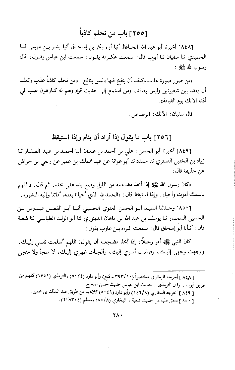 681 - أَخْبَرَنَا أَبُو عَبْدِ اللَّهِ الْحَافِظُ، أَنْبَأَنَا أَبُو بَكْرِ بْنُ إِسْحَاقَ، أَنْبَأَنَا بِشْرُ بْنُ مُوسَى، حَدَّثَنَا الْحُمَيْدِيُّ، حَدَّثَنَا سُفْيَانُ، حَدَّثَنَا أَيُّوبُ قَالَ: سَمِعْتُ عِكْرِمَةَ يَقُولُ: سَمِعْتُ ابْنَ عَبَّاسٍ يَقُولُ: قَالَ رَسُولُ اللَّهِ صَلَّى اللَّهُ عَلَيْهِ وَسَلَّمَ: §«مَنْ صَوَّرَ صُورَةً عُذِّبَ وَكُلِّفَ أَنْ يَنْفُخَ فِيهَا وَلَيْسَ بِنَافِخٍ. وَمَنْ تَحَلَّمَ كَاذِبًا عُذِّبَ وَكُلِّفَ أَنْ يَعْقِدَ بَيْنَ شَعِيرَتَيْنِ وَلَيْسَ بِعَاقِدٍ، وَمَنِ اسْتَمَعَ إِلَى حَدِيثِ قَوْمٍ وَهُمْ لَهُ كَارِهُونَ صُبَّ فِي أُذُنِهِ الْآنُكُ يَوْمَ الْقِيَامَةِ» . قَالَ سُفْيَانُ: الْآنُكُ: الرَّصَاصُ