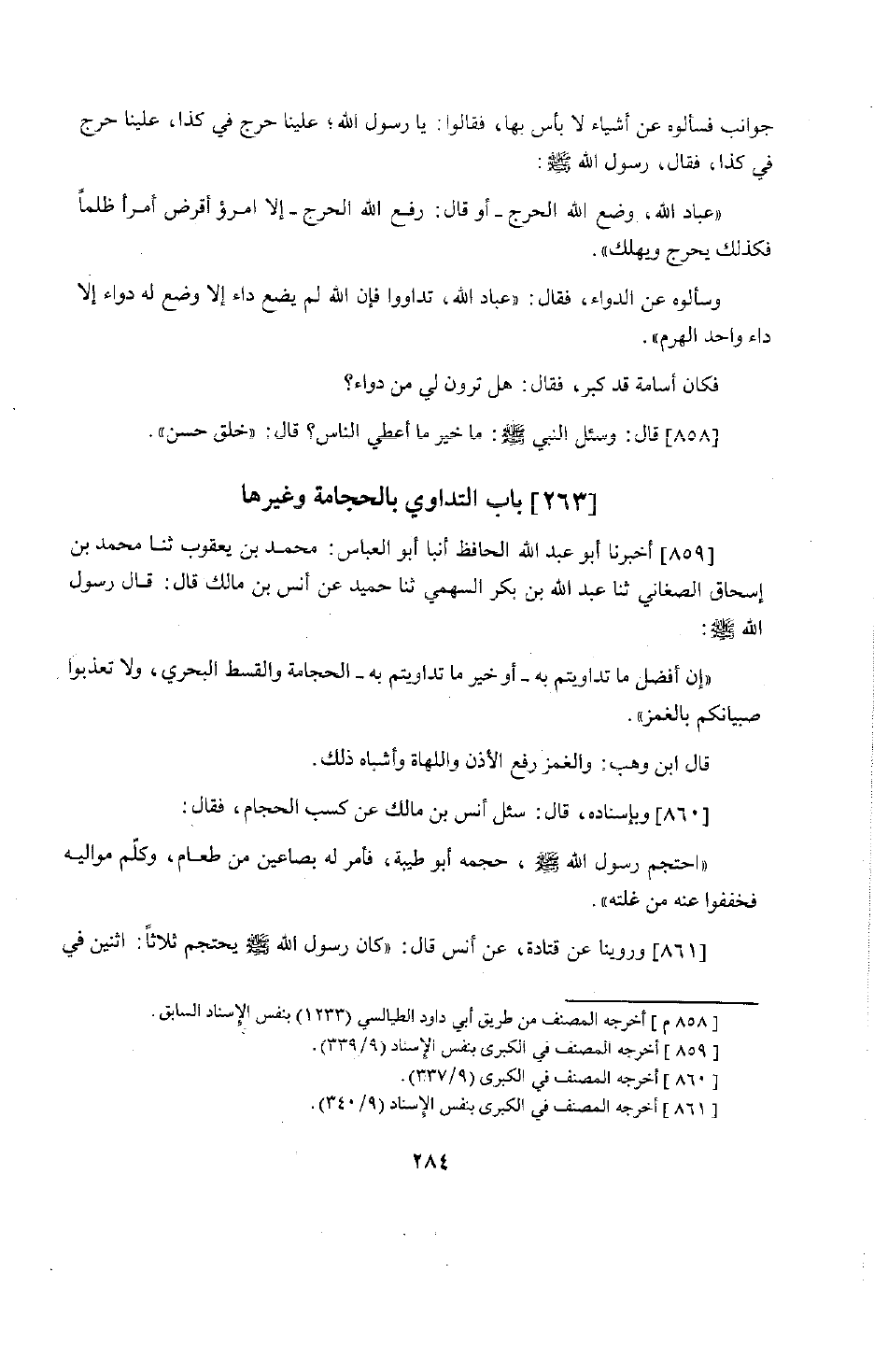694 - وَرُوِّينَا عَنْ قَتَادَةَ، عَنْ أَنَسٍ: كَانَ رَسُولُ اللَّهِ صَلَّى اللَّهُ عَلَيْهِ وَسَلَّمَ §يَحْتَجِمُ ثَلَاثًا: اثْنَيْنِ فِي -[285]- الْأَخْدَعَيْنِ وَوَاحِدٌ فِي الْكَاهِلِ. أَخْبَرَنَاهُ أَبُو الْخَيْرِ جَامِعُ بْنُ أَحْمَدَ الْمُحَمَّدَابَاذِيُّ، أَنْبَأَنَا أَبُو طَاهِرٍ الْمُحَمَّدَآبَاذِيُّ، حَدَّثَنَا عُثْمَانُ بْنُ سَعِيدٍ، حَدَّثَنَا عَلِيُّ بْنُ عُثْمَانَ اللَّاحِقِيُّ، حَدَّثَنَا جَرِيرٌ، عَنْ قَتَادَةَ، فَذَكَرَهُ. وَرُوِّينَا عَنِ ابْنِ عَبَّاسٍ قَالَ: «احْتَجَمَ رَسُولُ اللَّهِ صَلَّى اللَّهُ عَلَيْهِ وَسَلَّمَ فِي رَأْسِهِ مِنْ صُدَاعٍ كَانَ بِهِ أَوْ شَيْءٍ» ، وَرُوِيَ عَنْ أَنَسٍ: عَلَى ظَهْرِ قَدَمِهِ. وَقَدْ رُوِيَ عَنْ جَابِرٍ عَلَى وَرِكِهِ، وَالصَّحِيحُ رِوَايَةُ ابْنِ عَبَّاسٍ وَمَنْ تَابَعَهُ. وَرُوِيَ عَنْ أَبِي كَبْشَةَ عَلَى هَامَتِهِ وَبَيْنَ كَتِفَيْهِ، وَفِي الْحِجَامَةِ عَلَى الْهَامَةِ خَطَرٌ