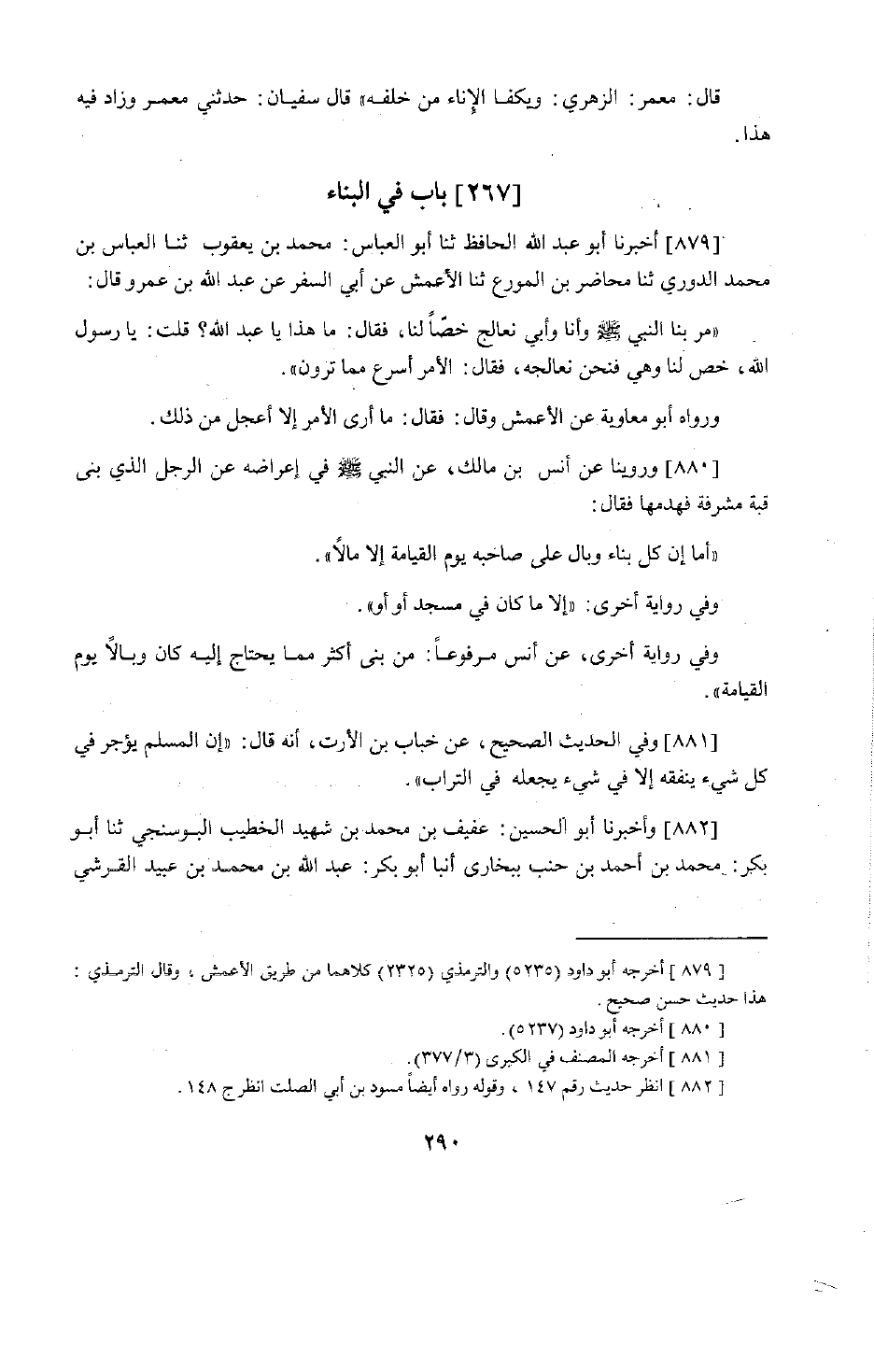 709 - أَخْبَرَنَا أَبُو عَبْدِ اللَّهِ الْحَافِظُ، حَدَّثَنَا أَبُو الْعَبَّاسِ مُحَمَّدُ بْنُ يَعْقُوبَ، حَدَّثَنَا الْعَبَّاسُ بْنُ مُحَمَّدٍ الدُّورِيُّ، حَدَّثَنَا مُحَاضِرُ بْنُ الْمُوَرِّعِ، حَدَّثَنَا الْأَعْمَشُ، عَنْ أَبِي السَّفَرِ، عَنْ عَبْدِ اللَّهِ بْنِ عَمْرٍو قَالَ: مَرَّ بِنَا النَّبِيُّ صَلَّى اللَّهُ عَلَيْهِ وَسَلَّمَ وَأَنَا وَأَبِي نُعَالِجُ خُصًّا لَنَا فَقَالَ: «مَا هَذَا يَا عَبْدَ اللَّهِ؟» قُلْتُ: يَا رَسُولَ اللَّهِ، خُصٌّ لَنَا وَهَى فَنَحْنُ نُعَالِجُهُ، فَقَالَ: «§الْأَمْرُ أَسْرَعُ مِمَّا تَرَوْنَ» . وَرَوَاهُ أَبُو مُعَاوِيَةَ، عَنِ الْأَعْمَشِ، وَقَالَ: فَقَالَ: «مَا أَرَى الْأَمْرَ إِلَّا أَعْجَلَ مِنْ ذَلِكَ» . وَرُوِّينَا عَنْ أَنَسِ بْنِ مَالِكٍ عَنِ النَّبِيِّ صَلَّى اللَّهُ عَلَيْهِ وَسَلَّمَ فِي إِعْرَاضِهِ عَنِ الرَّجُلِ الَّذِي بَنَى قُبَّةً مُشْرِفَةً فَهَدَمَهَا فَقَالَ: «أَمَا إِنَّ كُلَّ بِنَاءٍ وَبَالٌ عَلَى صَاحِبِهِ يَوْمَ الْقِيَامَةِ إِلَّا مَالَا» . وَفِي رِوَايَةٍ أُخْرَى: ". . . إِلَّا مَا كَانَ فِي مَسْجِدٍ أَوْ، أَوْ. وَفِي رِوَايَةٍ أُخْرَى، عَنْ أَنَسٍ مَرْفُوعًا: «مَنْ بَنَى أَكْثَرَ مِمَّا يَحْتَاجُ إِلَيْهِ كَانَ وَبَالًا يَوْمَ الْقِيَامَةِ» ، وَفِي الْحَدِيثِ الصَّحِيحِ، عَنْ خَبَّابِ بْنِ الْأَرَتِّ أَنَّهُ قَالَ: «إِنَّ الْمُسْلِمَ يُؤْجَرُ فِي كُلِّ شَيْءٍ يُنْفِقُهُ إِلَّا فِي شَيْءٍ يَجْعَلُهُ فِي التُّرَابِ»